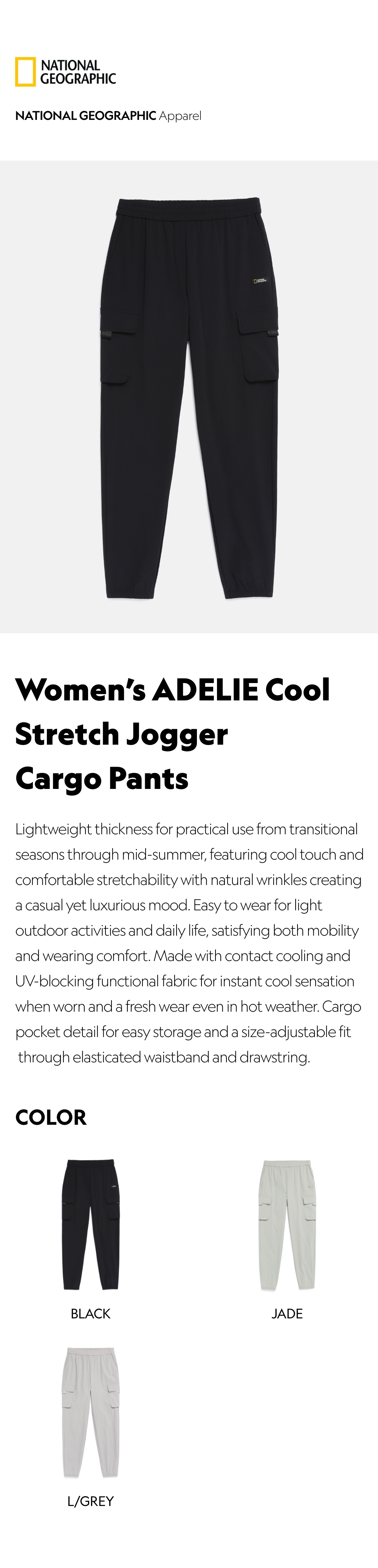Lightweight thickness for practical use from transitional seasons through mid-summer, featuring cool touch and comfortable stretchability with natural wrinkles creating a casual yet luxurious mood. Easy to wear for light outdoor activities and daily life, satisfying both mobility and wearing comfort. Made with contact cooling and UV-blocking functional fabric for instant cool sensation when worn and a fresh wear even in hot weather. Cargo pocket detail for easy storage and a size-adjustable fit through elasticated waistband and drawstring.