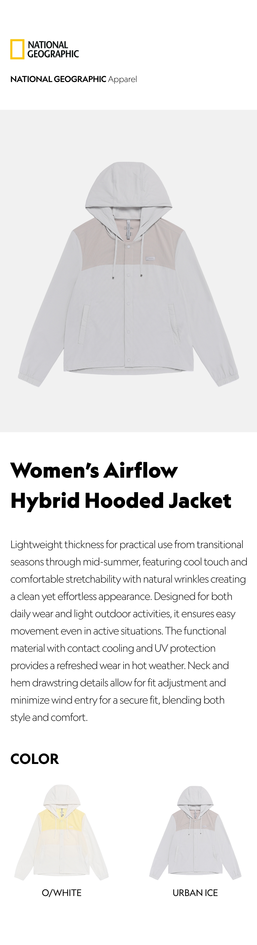 Lightweight thickness for practical use from transitional seasons through mid-summer, featuring cool touch and comfortable stretchability with natural wrinkles creating a clean yet effortless appearance. Designed for both daily wear and light outdoor activities, it ensures easy movement even in active situations. The functional material with contact cooling and UV protection provides a refreshed wear in hot weather. Neck and hem drawstring details allow for fit adjustment and minimize wind entry for a secure fit, blending both style and comfort.