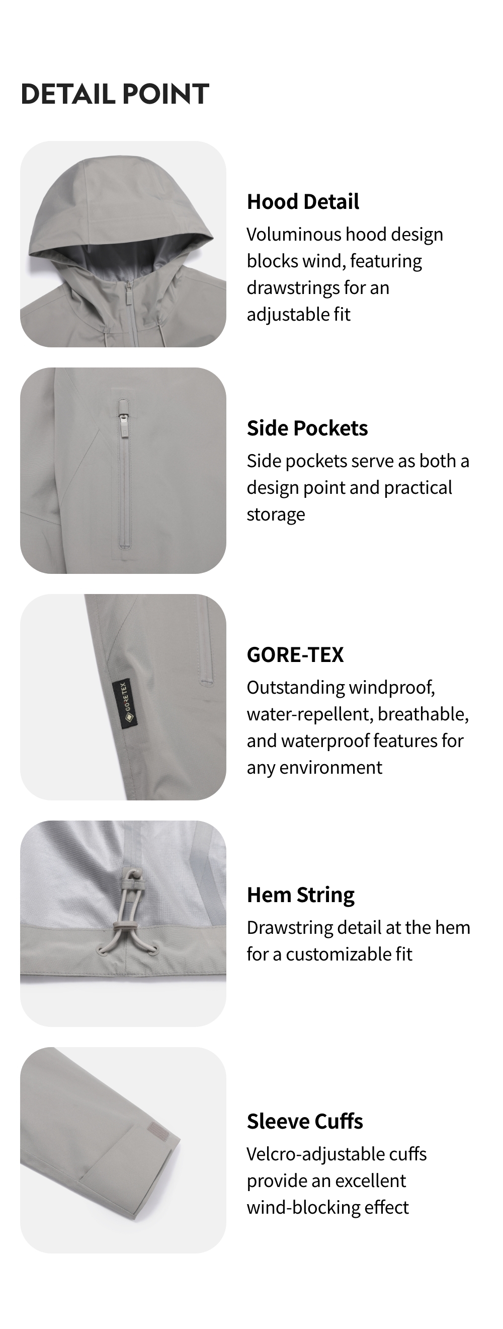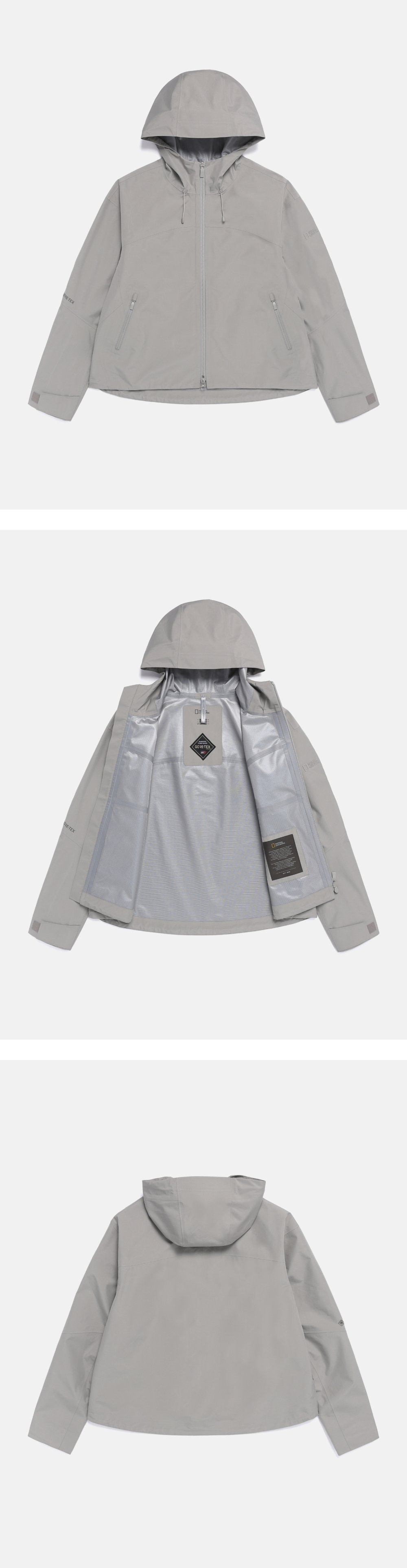 A women's semi-cropped waterproof jacket made with GORE-TEX 3-layer fabric, delivering excellent windproof, water-repellent, and breathable performance. Adjustable hood and hem drawstrings allow for a customizable silhouette and enhanced wind protection. Waterproof zippers ensure a complete protection. Side zippered pockets provide convenient storage, and the asymmetrical hem offers natural body coverage.