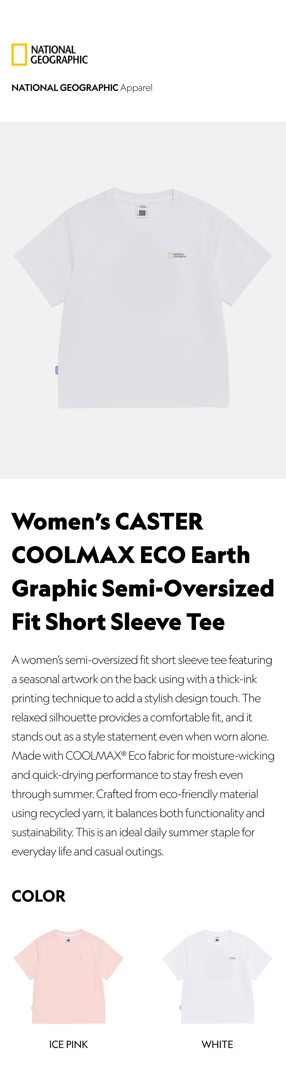 A women's semi-oversized fit short sleeve tee featuring a seasonal artwork on the back using with a thick-ink printing technique to add a stylish design touch. The relaxed silhouette provides a comfortable fit, and it stands out as a style statement even when worn alone. Made with COOLMAX® Eco fabric for moisture-wicking and quick-drying performance to stay fresh even through summer. Crafted from eco-friendly material using recycled yarn, it balances both functionality and sustainability. This is an ideal daily summer staple for everyday life and casual outings.