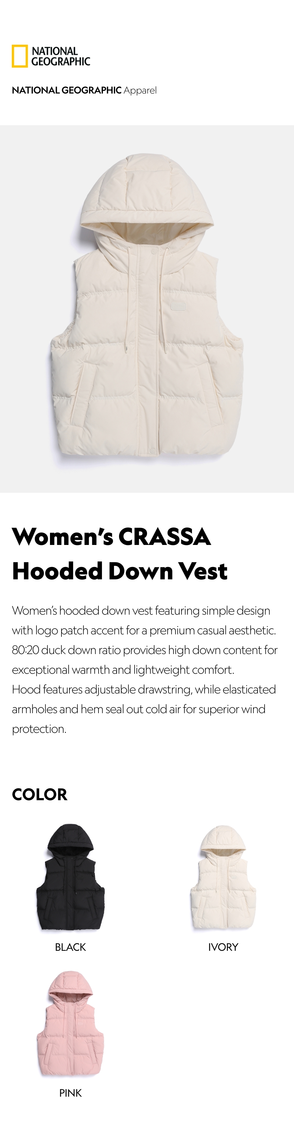 Women's hooded down vest featuring simple design with logo patch accent for a premium casual aesthetic.