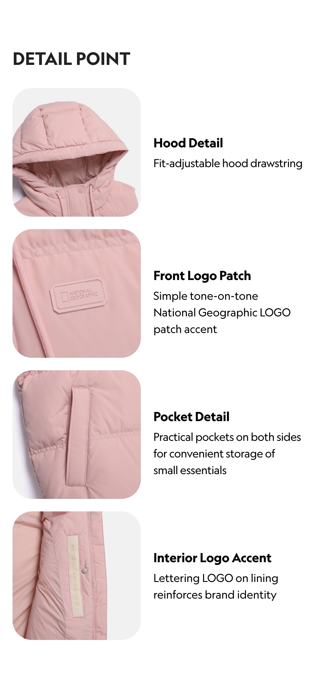 Women's hooded down vest featuring simple design with logo patch accent for a premium casual aesthetic.