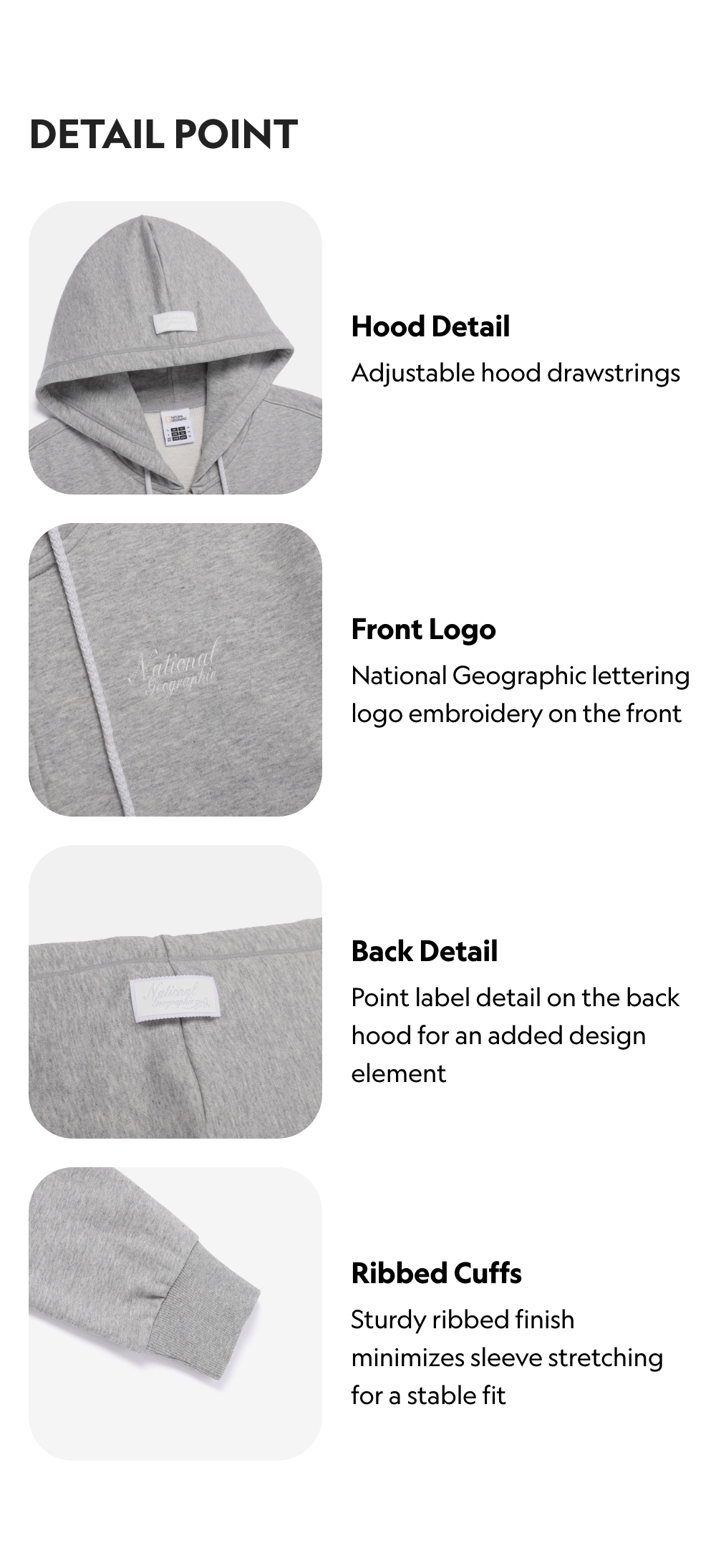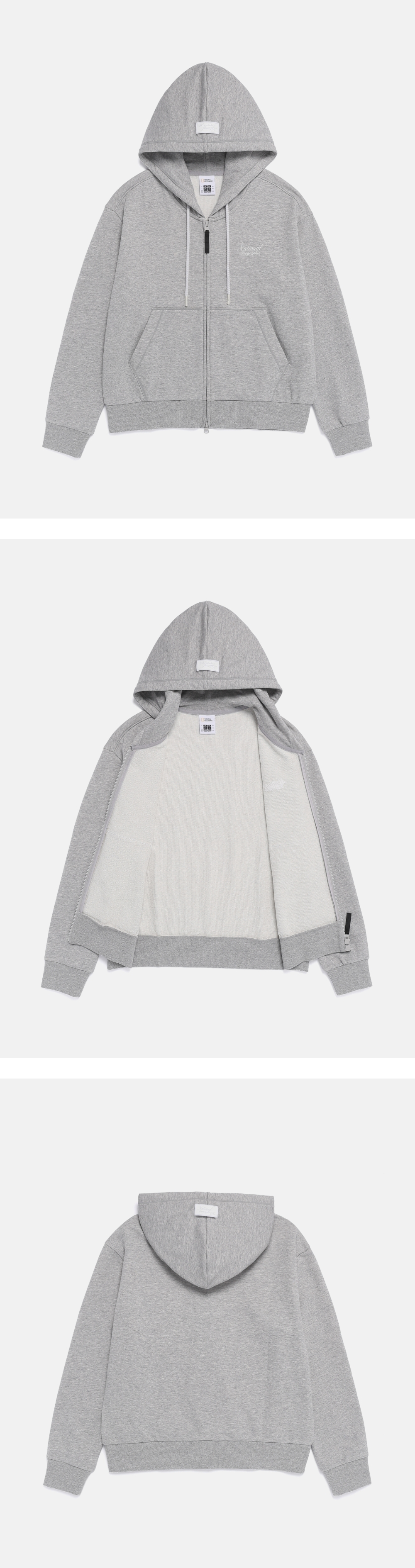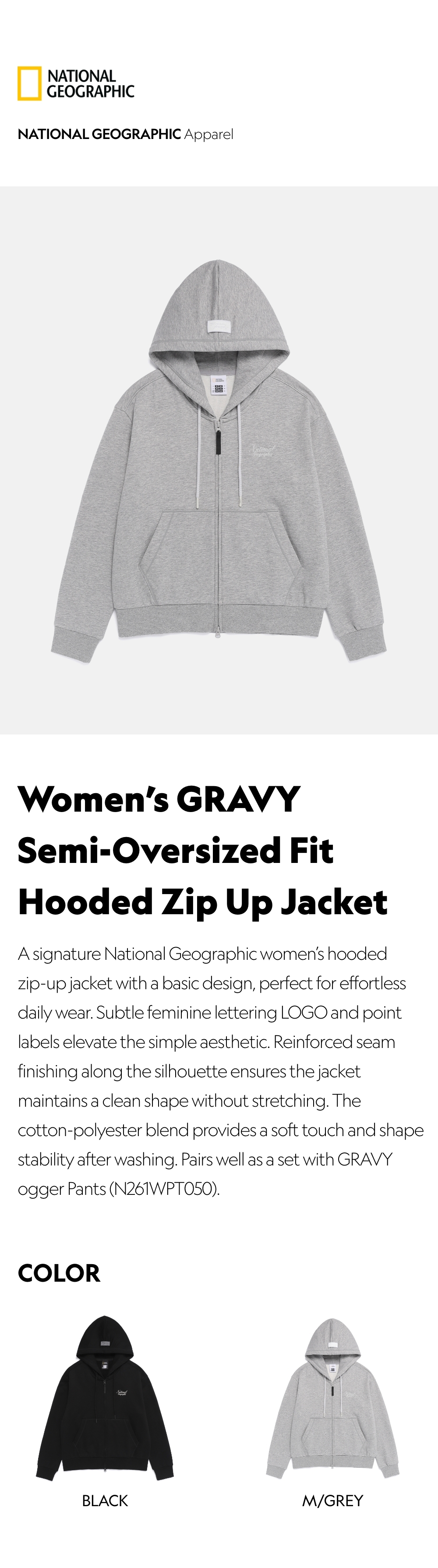 A signature National Geographic women's hooded zip-up jacket with a basic design, perfect for effortless daily wear. Subtle feminine lettering LOGO and point labels elevate the simple aesthetic. Reinforced seam finishing along the silhouette ensures the jacket maintains a clean shape without stretching. The cotton-polyester blend provides a soft touch and shape stability after washing. Pairs well as a set with GRAVY Jogger Pants (N261WPT050).
