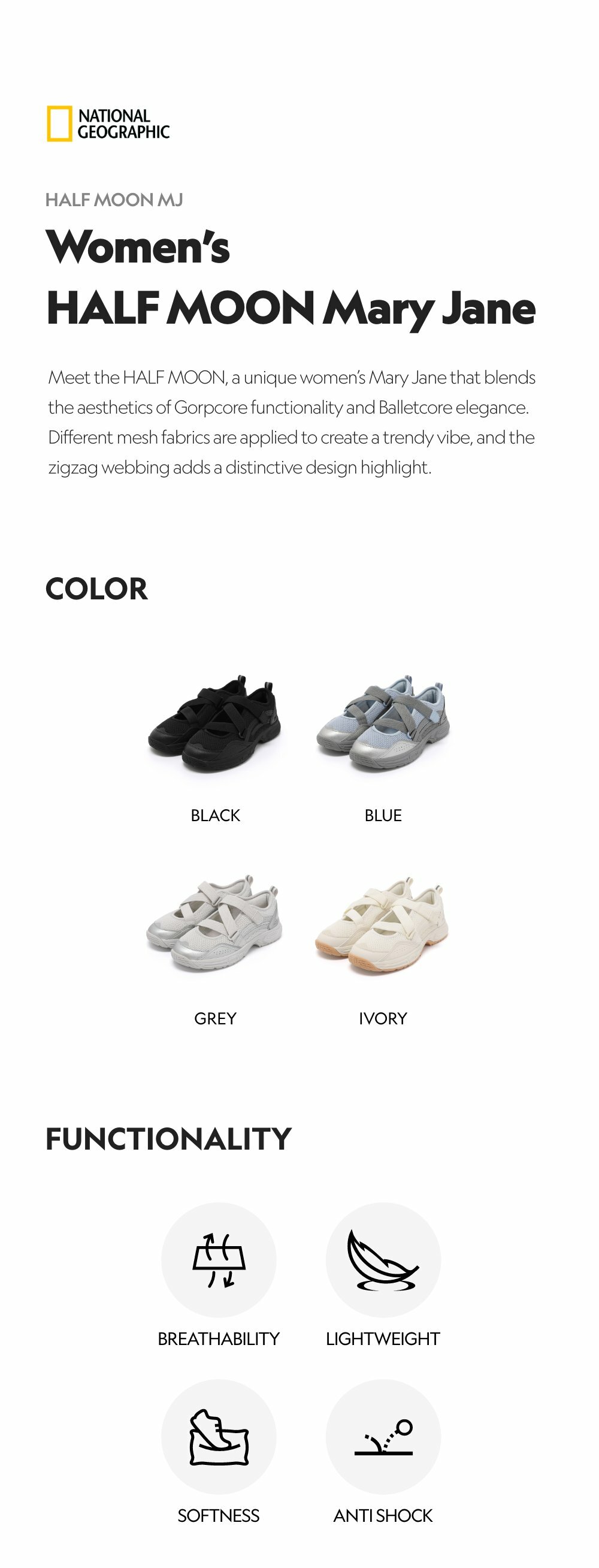 Meet the HALF MOON, a unique women’s Mary Jane that blends the aesthetics of Gorpcore functionality and Balletcore elegance. Different mesh fabrics are applied to create a trendy vibe, and the zigzag webbing adds a distinctive design highlight.