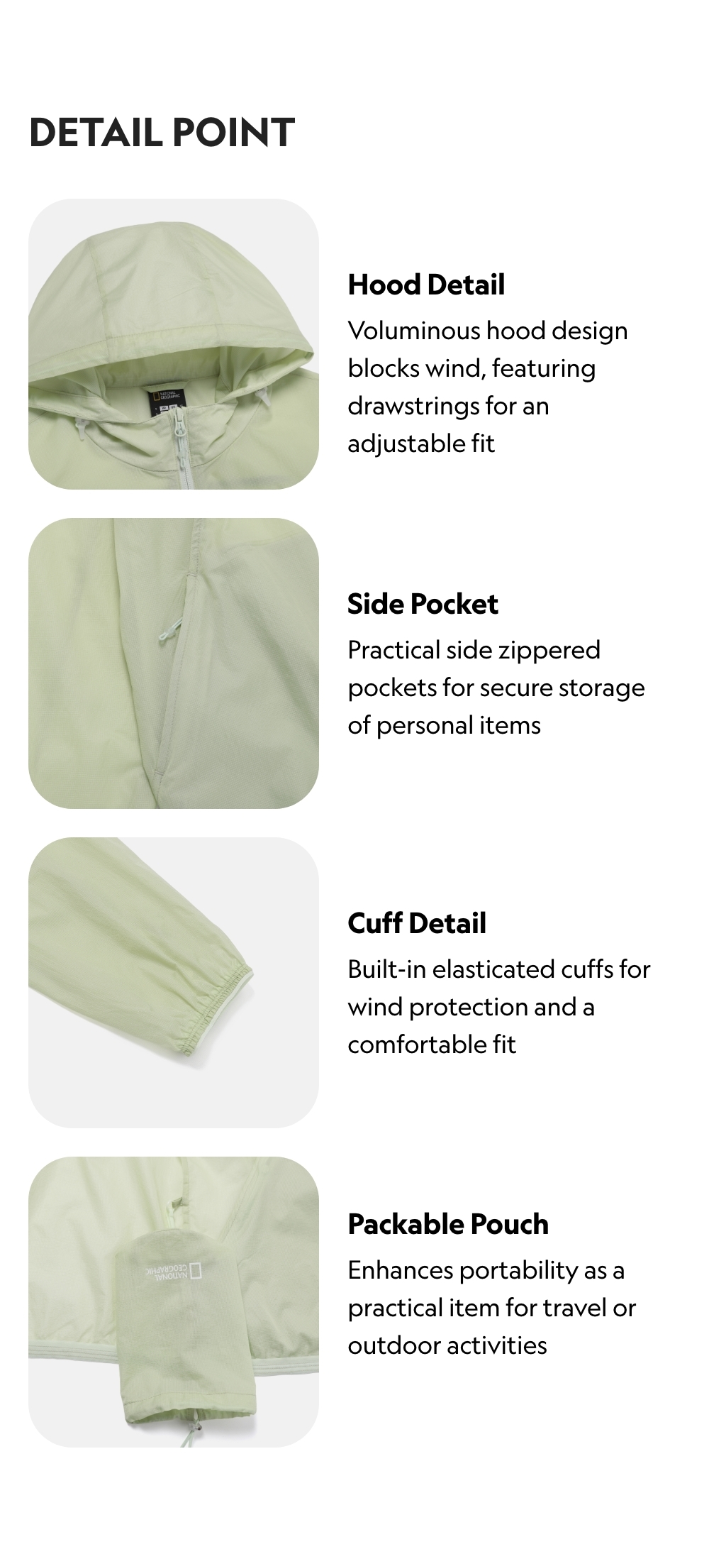 Voluminous hood design blocks wind, featuring drawstrings for an adjustable fit