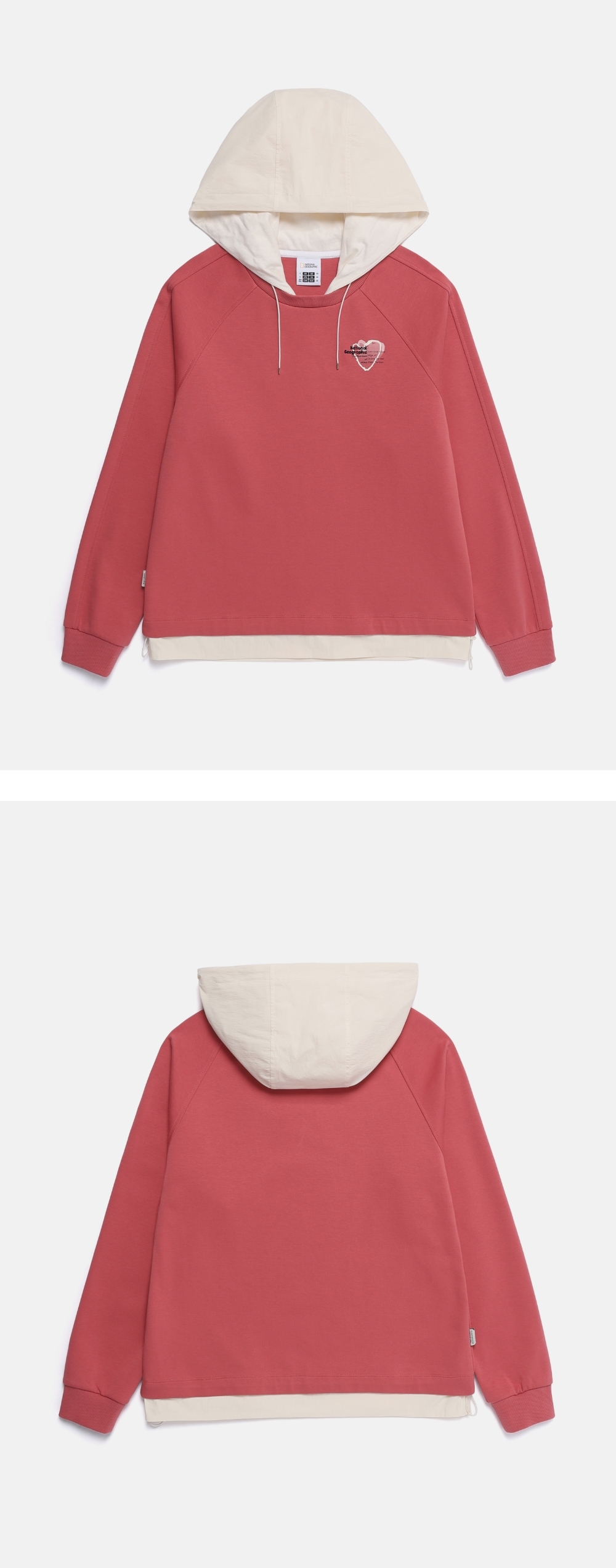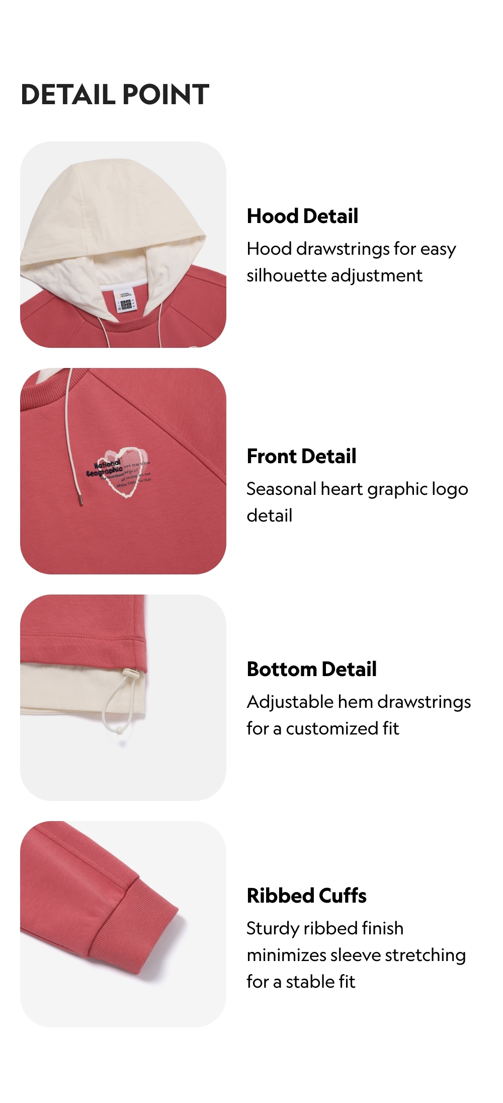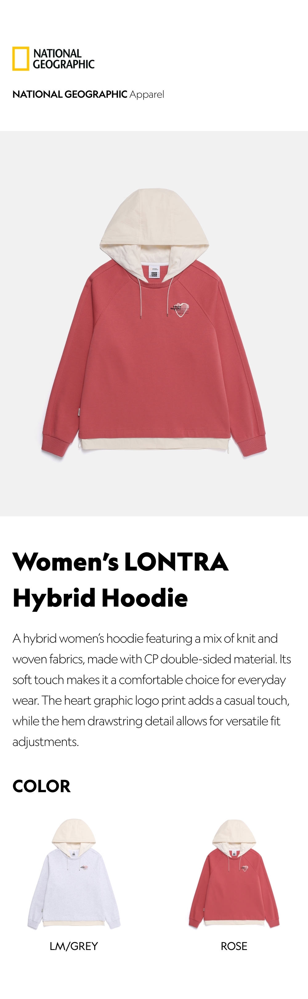 A hybrid women's hoodie featuring a mix of knit and woven fabrics, made with CP double-sided material. Its soft touch makes it a comfortable choice for everyday wear. The heart graphic logo print adds a casual touch, while the hem drawstring detail allows for versatile fit adjustments.