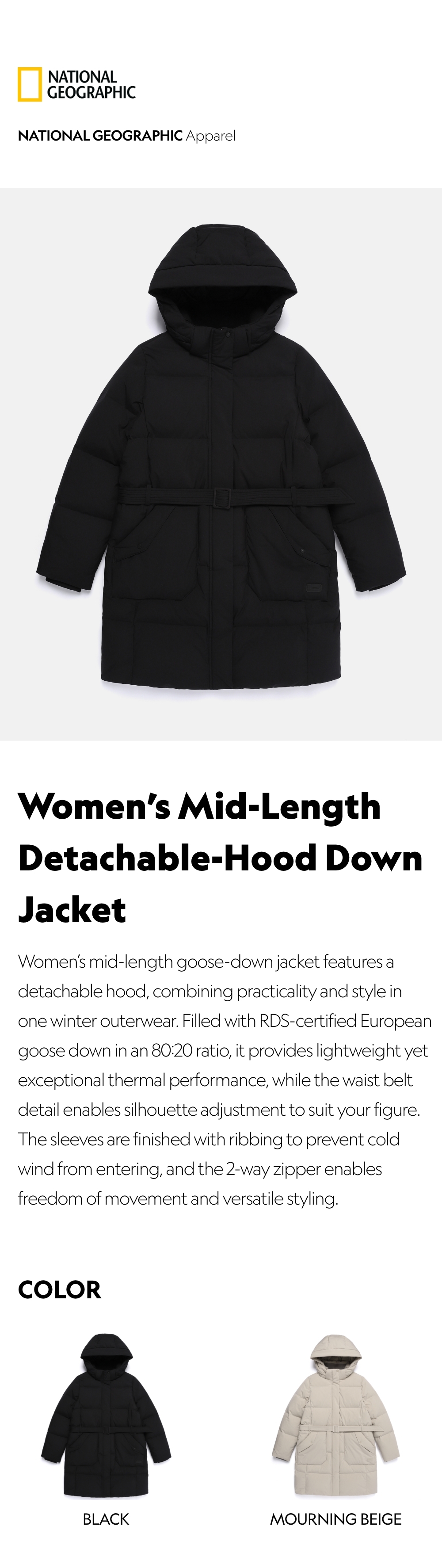Women’s mid-length goose-down jacket features a detachable hood, combining practicality and style in one winter outerwear.