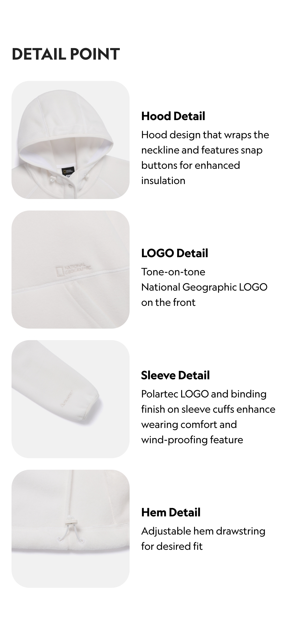 Hood design that wraps the neckline and features snap buttons for enhanced insulation