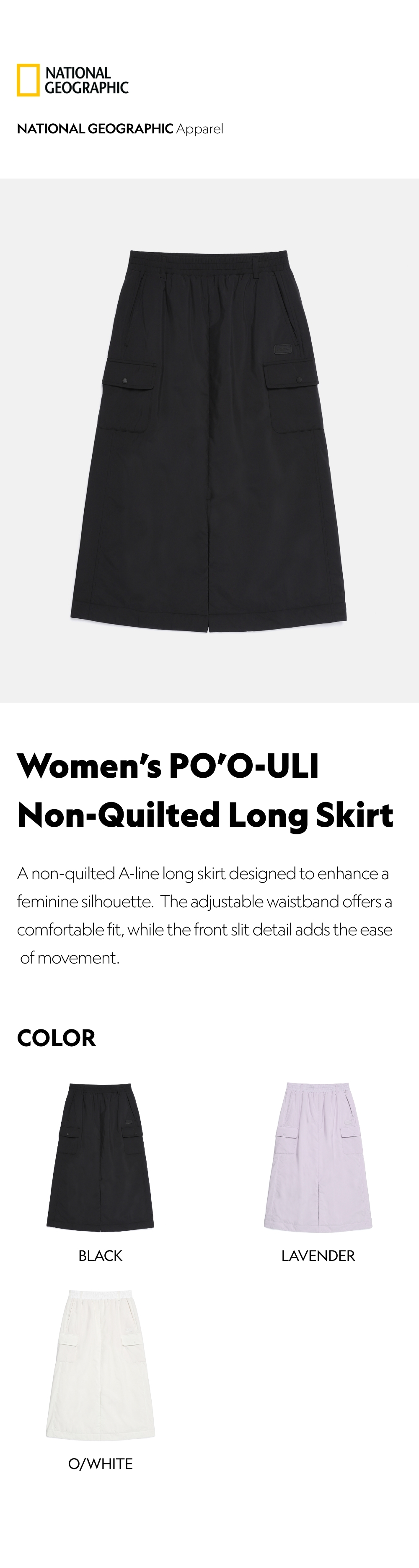 A non-quilted A-line long skirt designed to enhance a feminine silhouette.