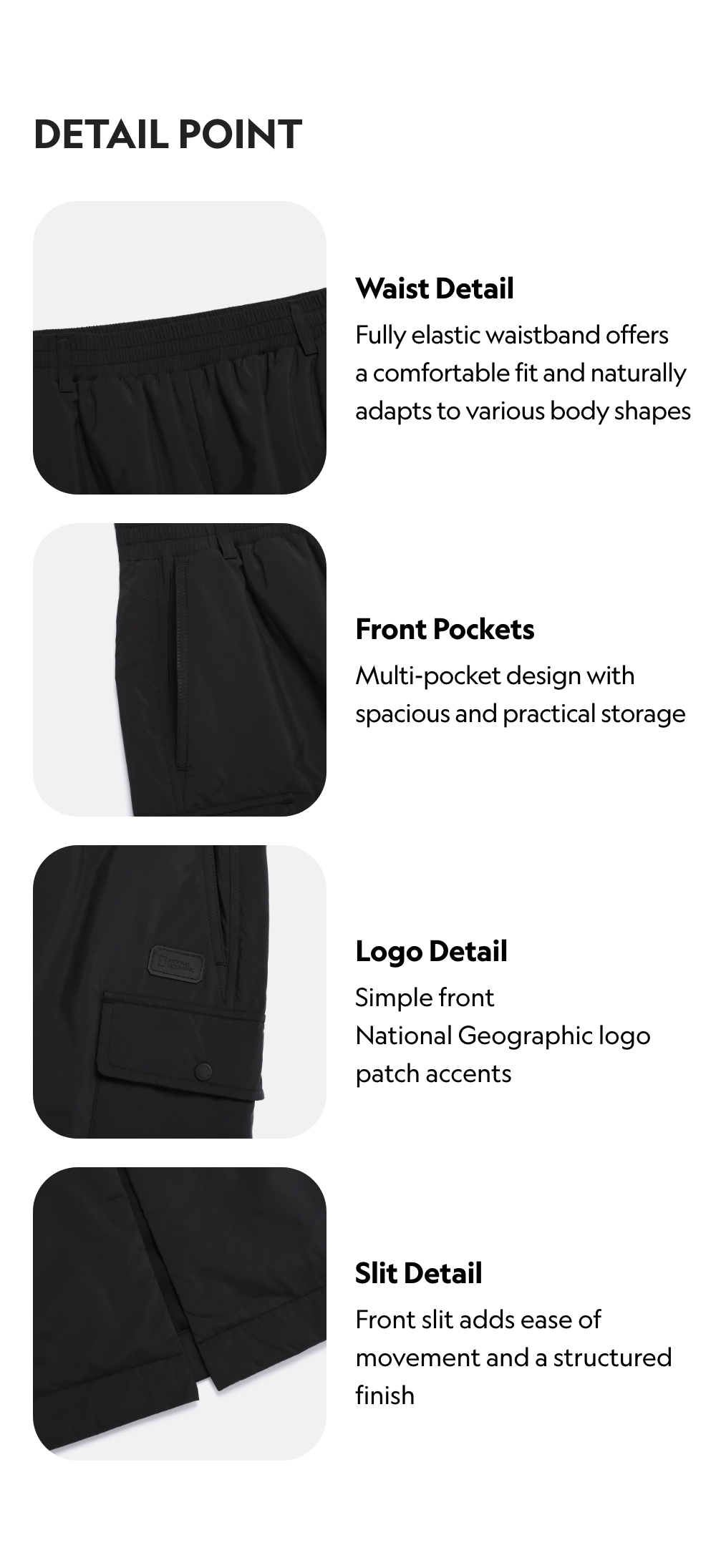 Fully elastic waistband offers a comfortable fit and naturally adapts to various body shapes