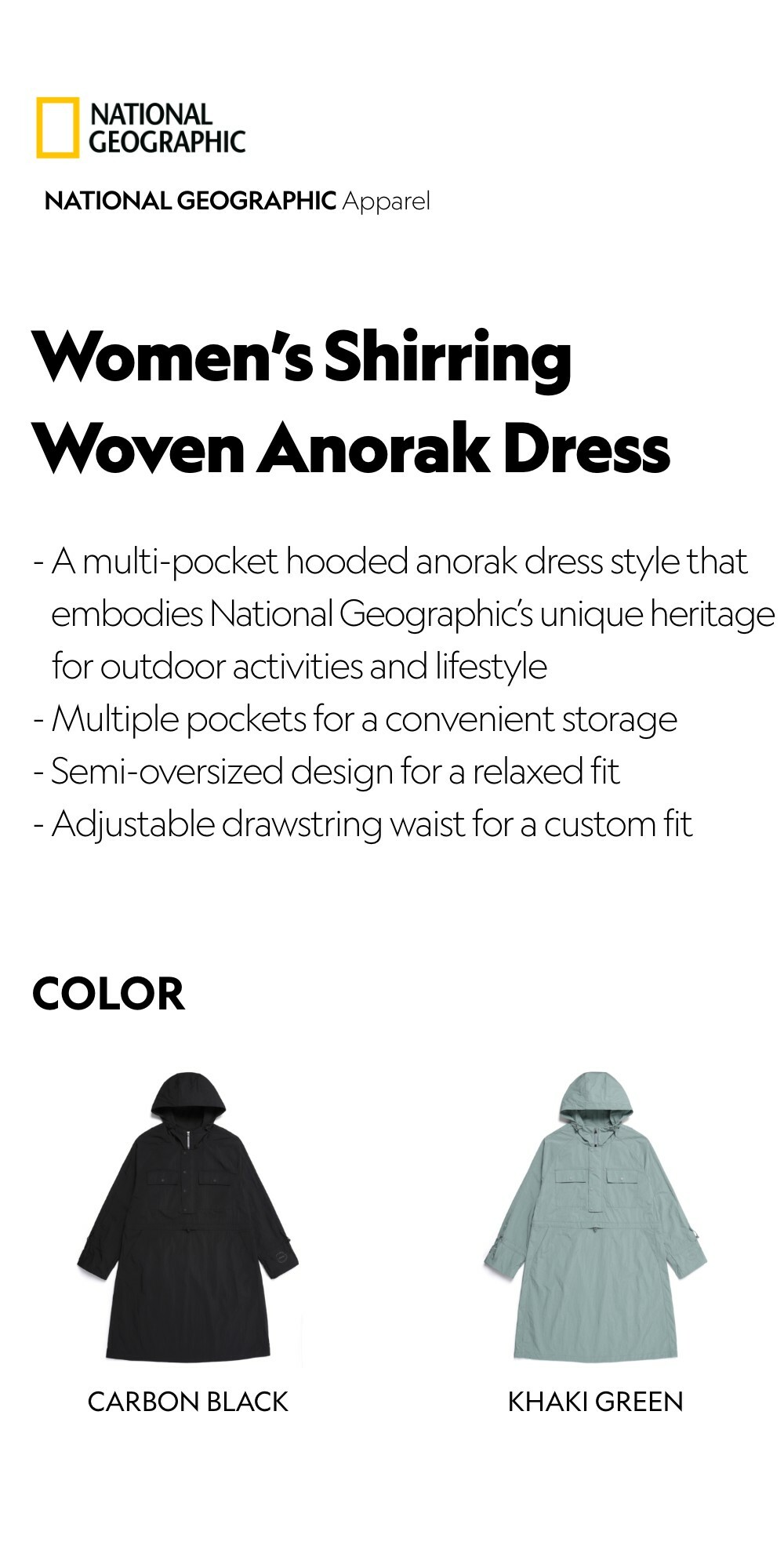 - A multi-pocket hooded anorak dress style that embodies National Geographic’s unique heritage for outdoor activities and lifestyle