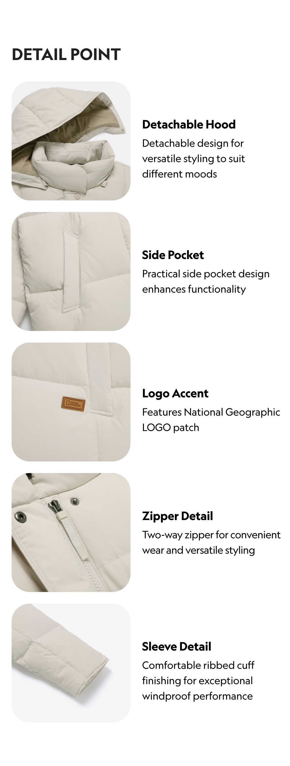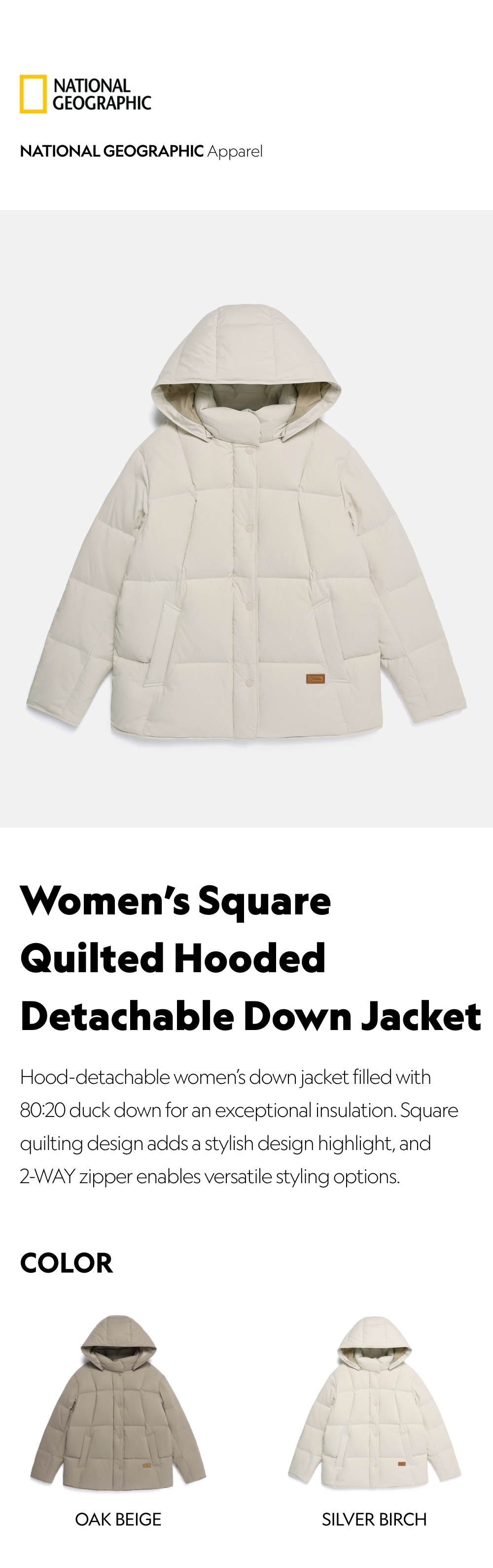 Hood-detachable women's down jacket filled with 80:20 duck down for an exceptional insulation.