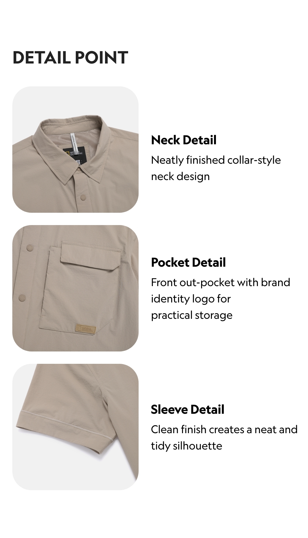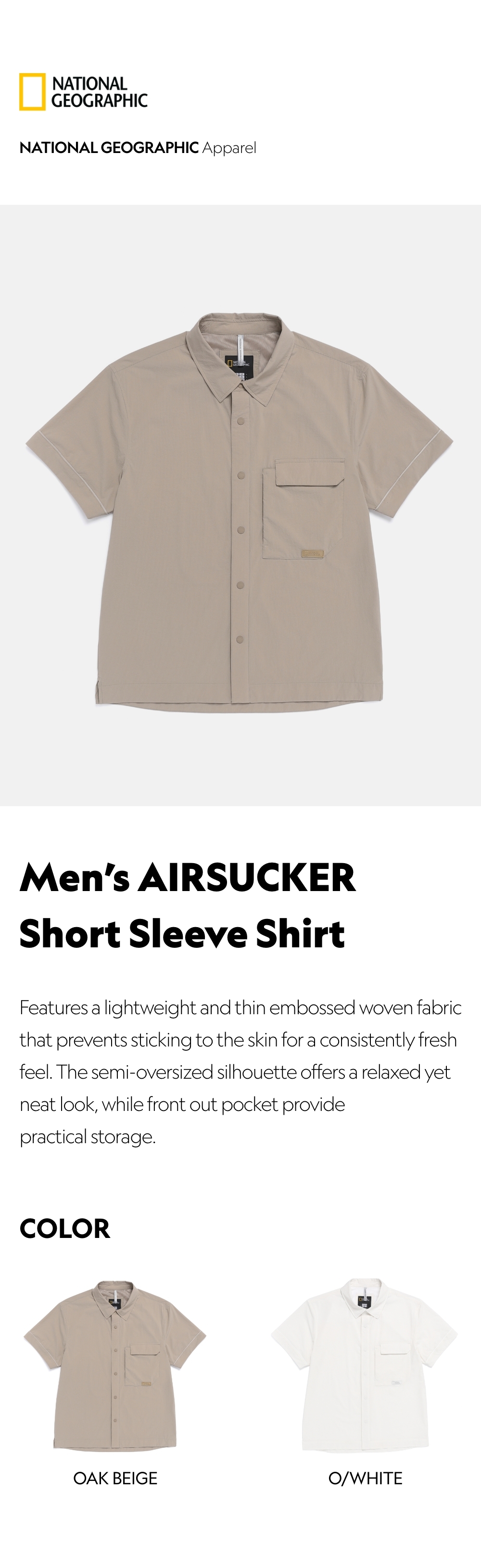 Features a lightweight and thin embossed woven fabric that prevents sticking to the skin for a consistently fresh feel. The semi-oversized silhouette offers a relaxed yet neat look, while front out pocket provide practical storage.