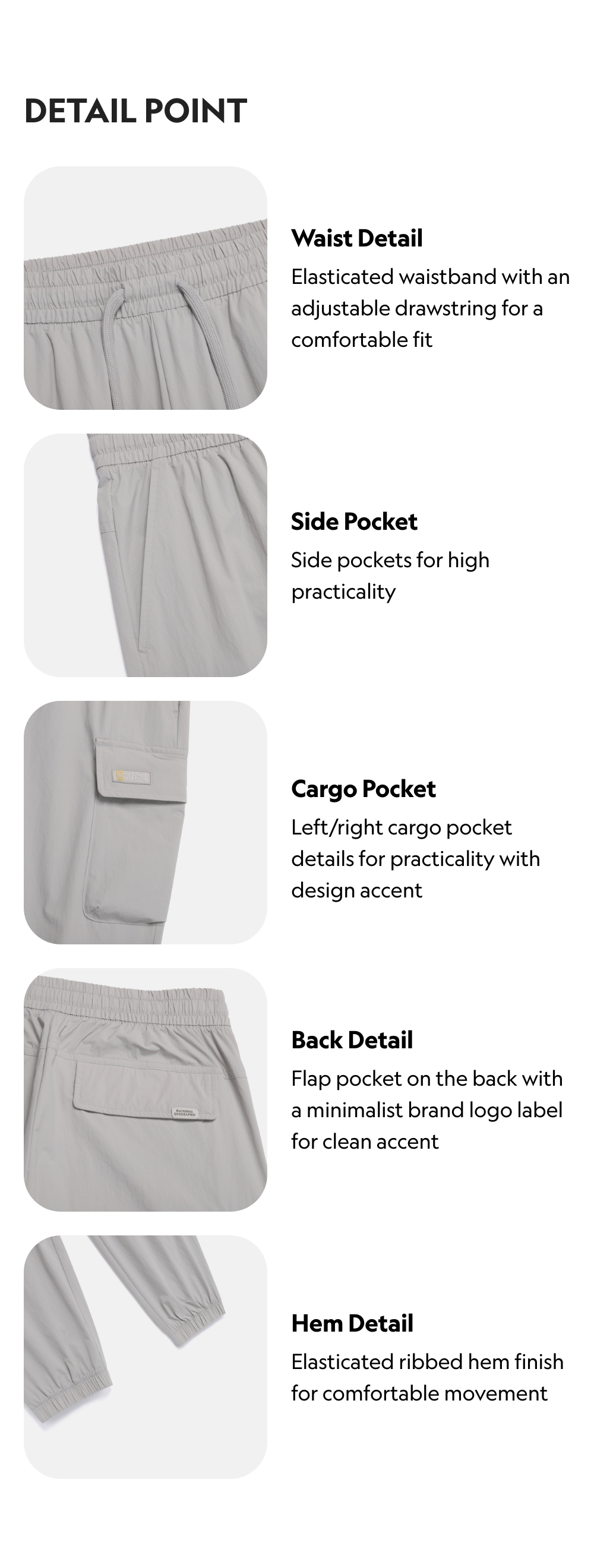 Elasticated ribbed hem finish for comfortable movement
