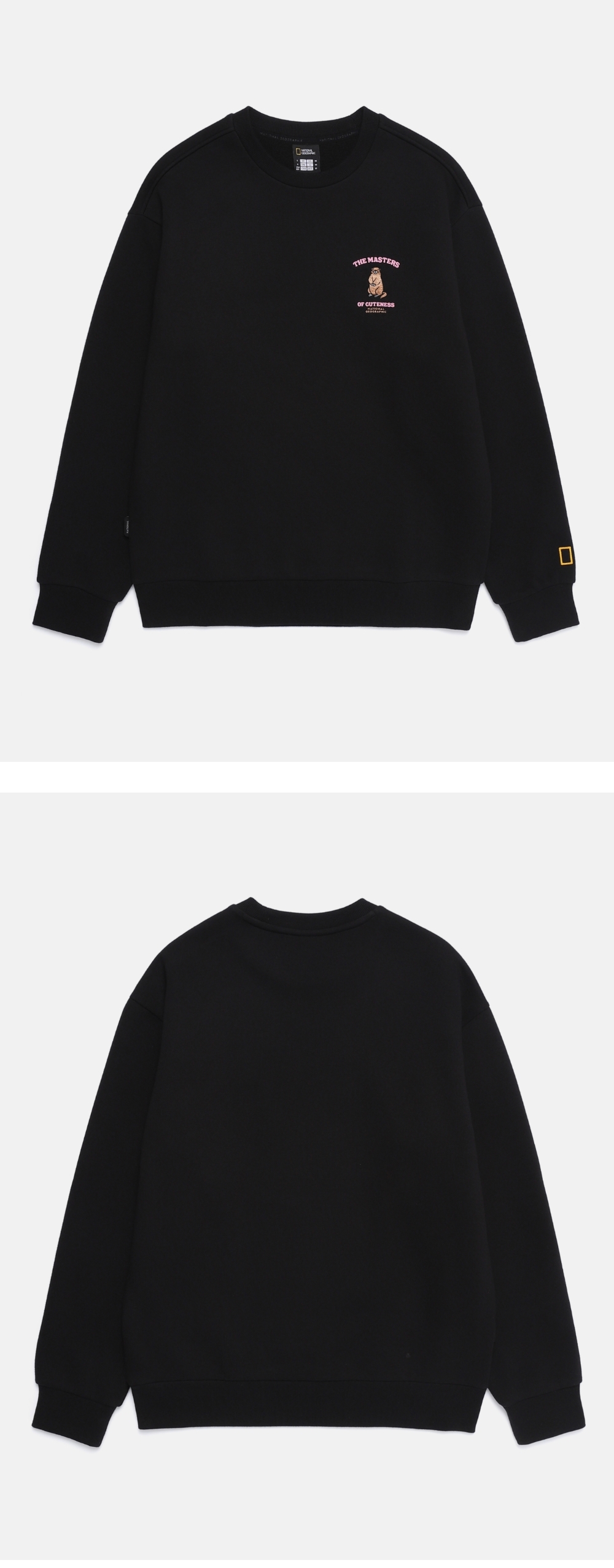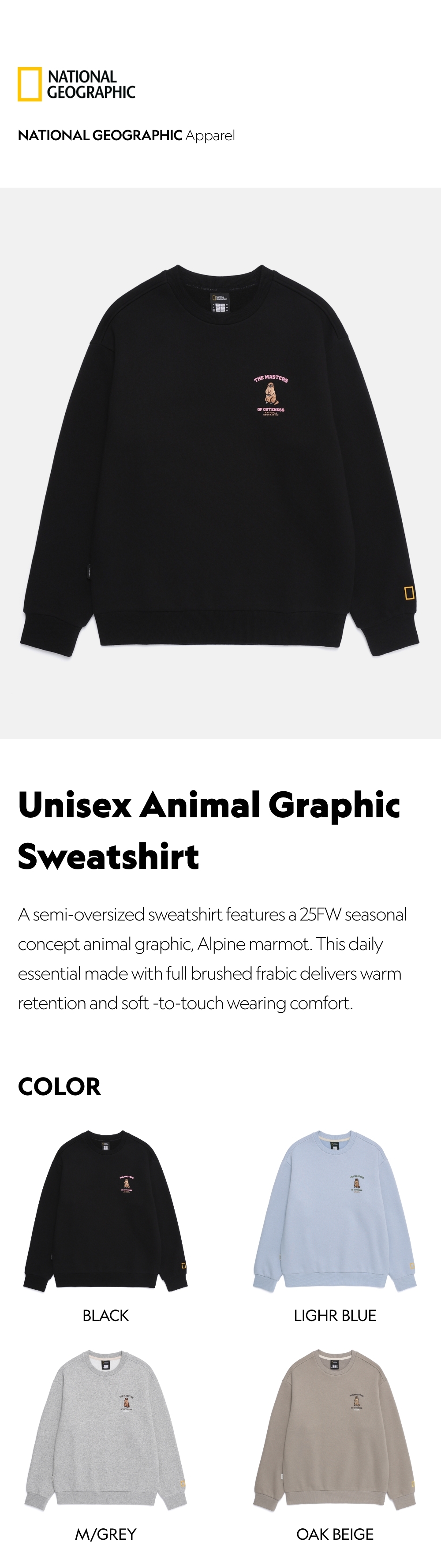 A semi-oversized sweatshirt features a 25FW seasonal concept animal graphic, Alpine marmot.