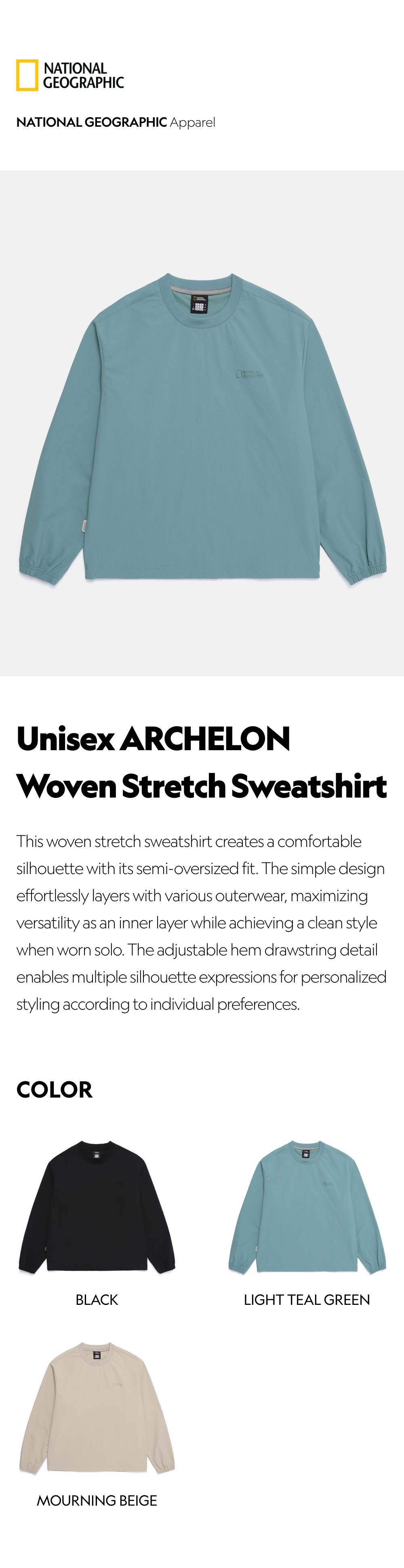 - This woven stretch sweatshirt creates a comfortable silhouette with its semi-oversized fit. The simple design effortlessly layers with various outerwear, maximizing versatility as an inner layer while achieving a clean style when worn solo. The adjustable hem drawstring detail enables multiple silhouette expressions for personalized styling according to individual preferences.