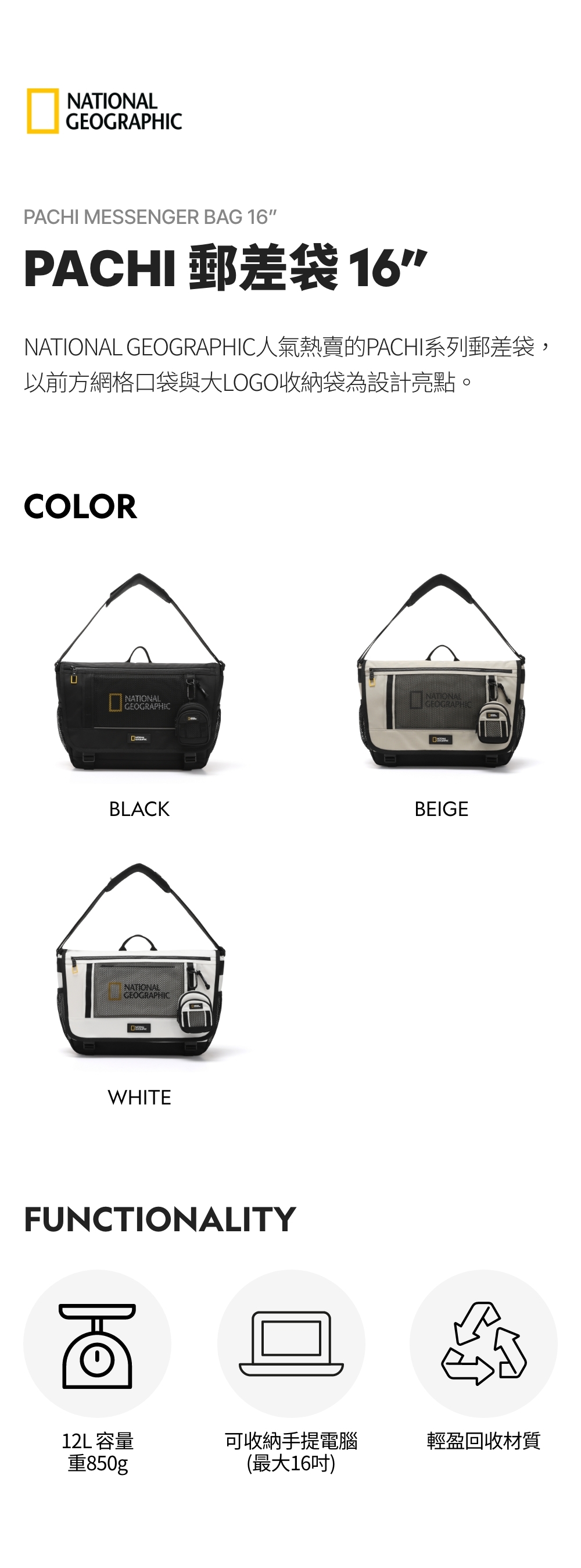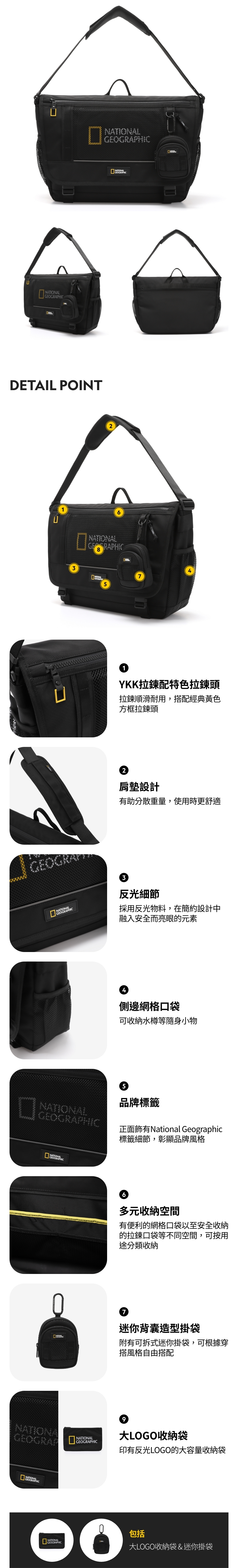 National Geographic人氣熱賣的PACHI系列郵差袋,以前方網格口袋與大LOGO收納袋為設計亮點。