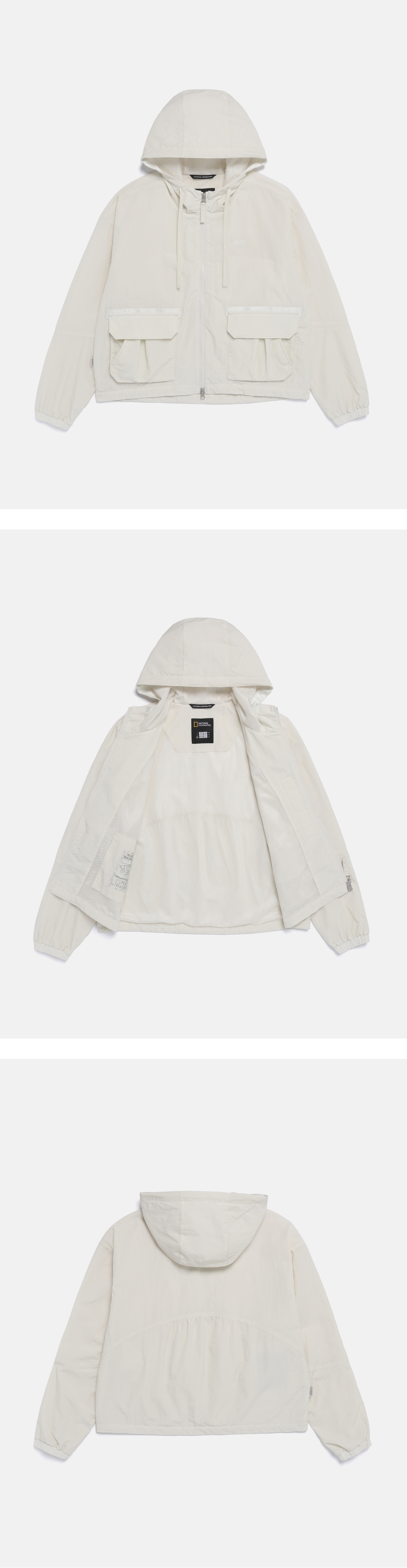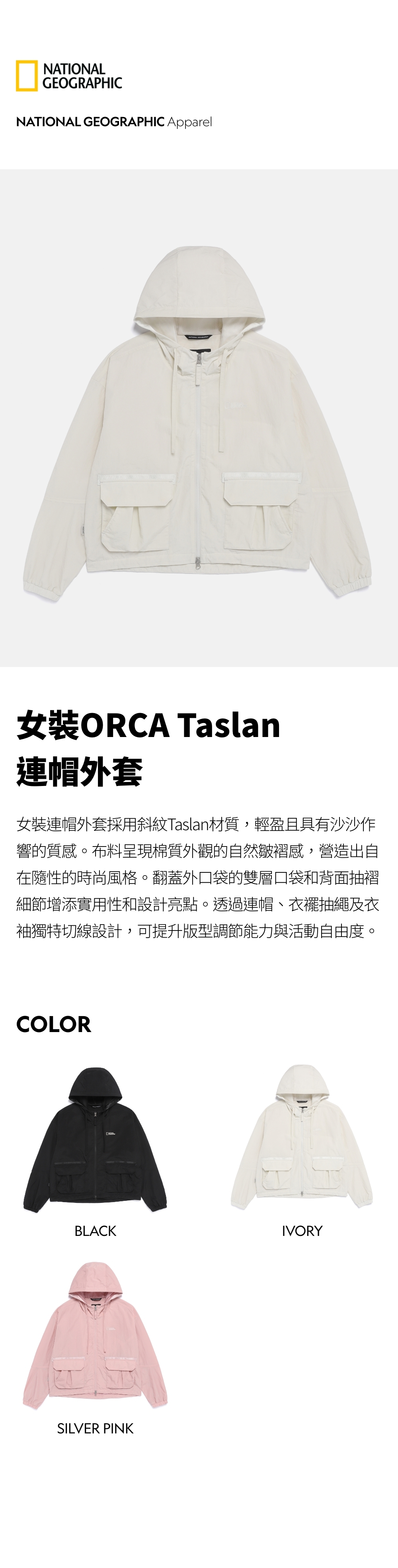 女裝連帽外套採用斜紋Taslan材質,輕盈且具有沙沙作響的質感。布料呈現棉質外觀的自然皺褶感,營造出自在隨性的時尚風格。翻蓋外口袋的雙層口袋和背面抽褶細節增添實用性和設計亮點。透過連帽、衣襬抽繩及衣袖獨特切線設計,可提升版型調節能力與活動自由度。