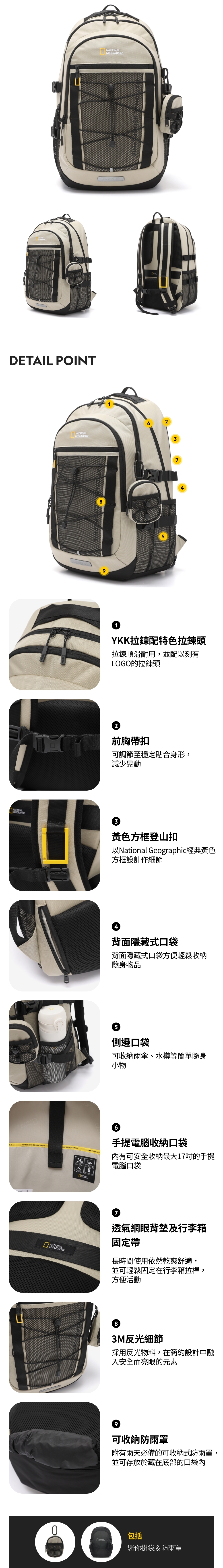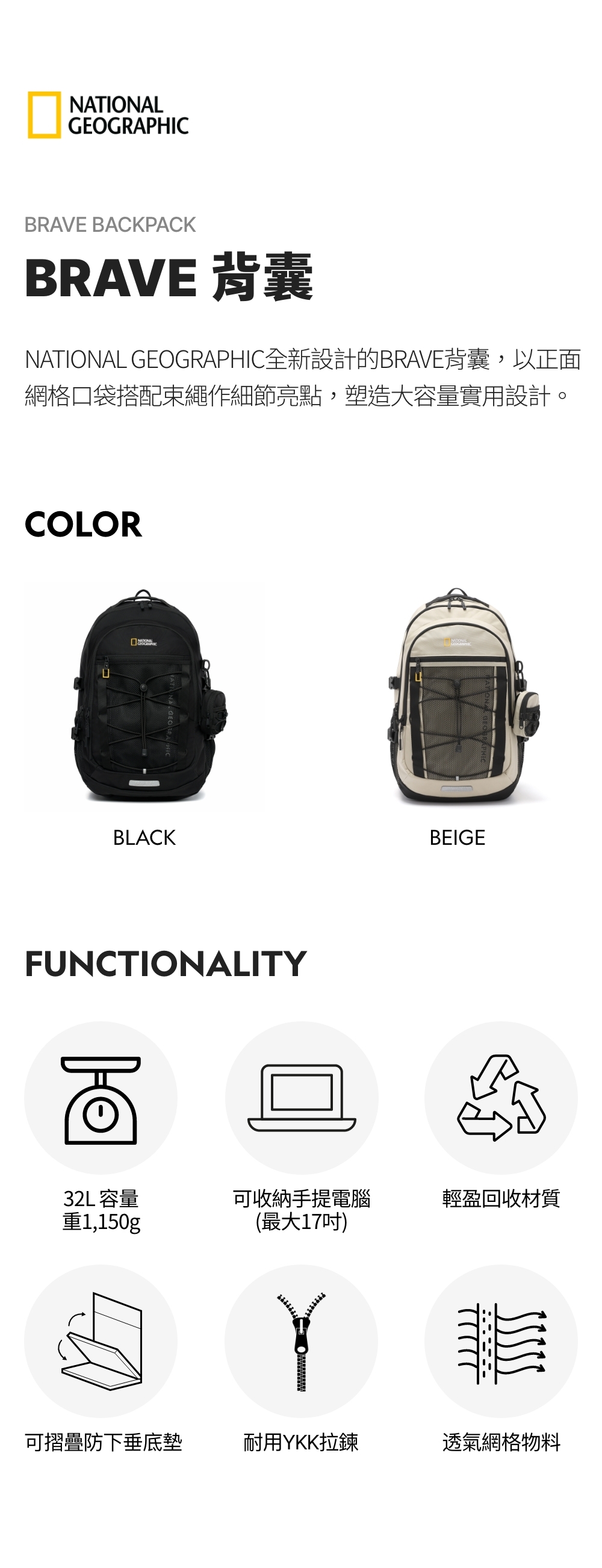 National Geographic全新設計的BRAVE背囊,以正面網格口袋搭配束繩作細節亮點,塑造大容量實用設計。