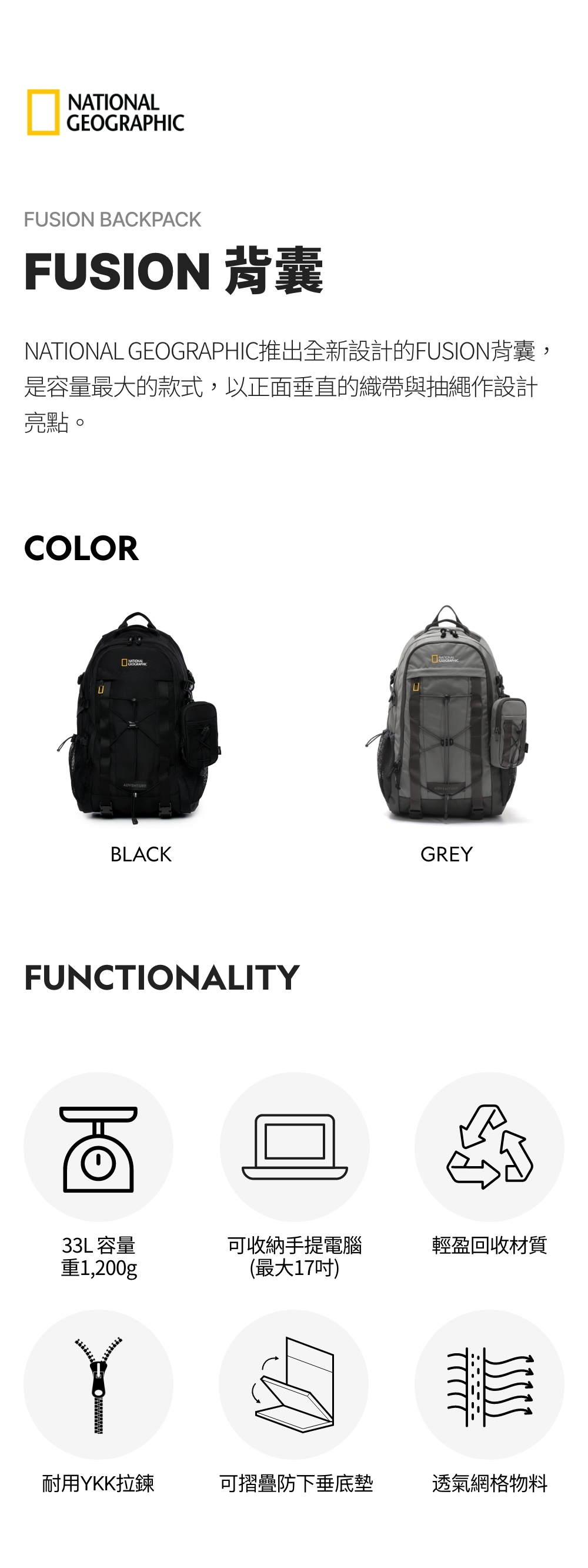 National Geographic推出全新設計的FUSION背囊,是容量最大的款式,以正面垂直的織帶與抽繩作設計亮點。