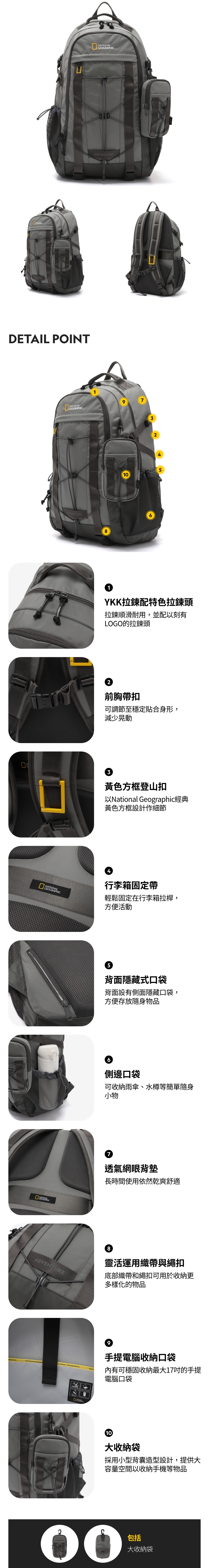 10. 大收納袋:採用小型背囊造型設計,提供大容量空間以收納手機等物品