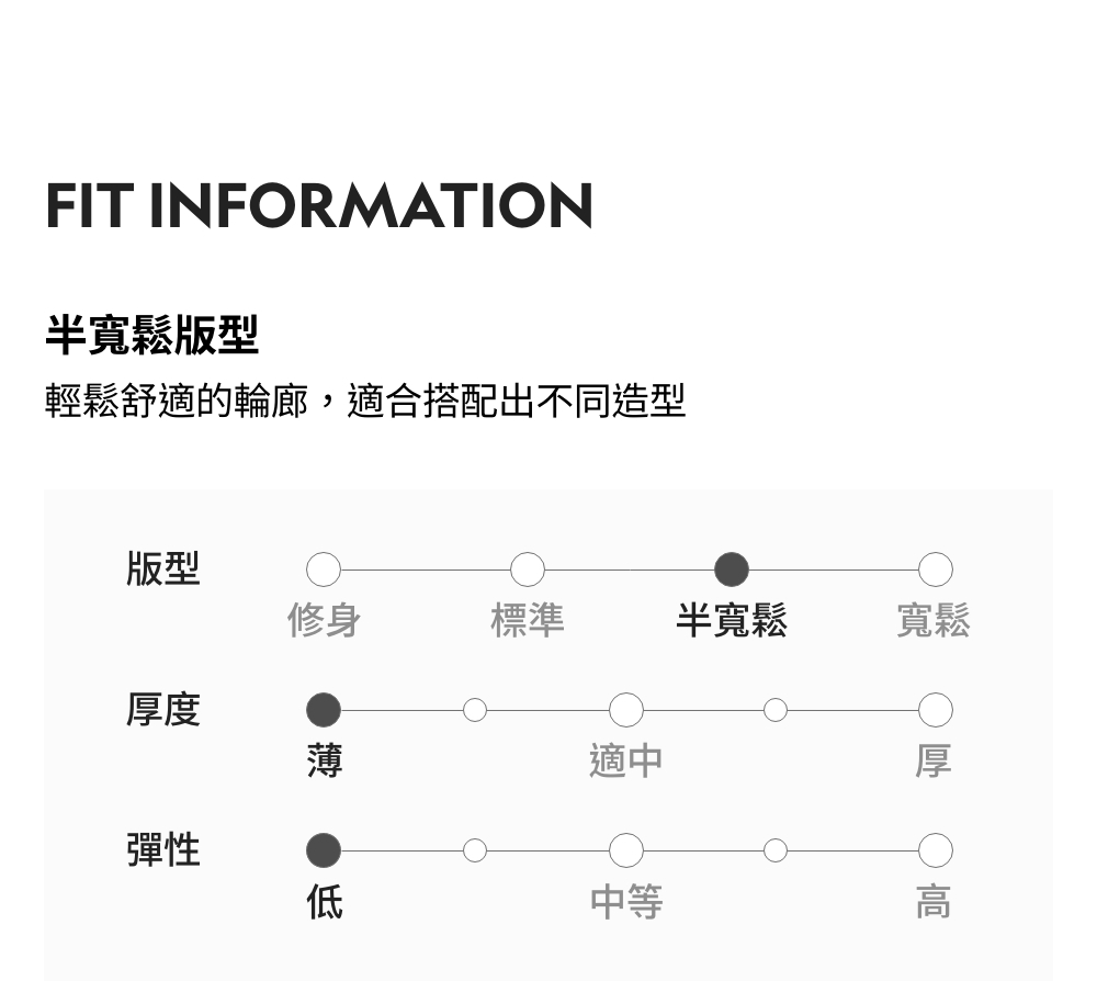 半寬鬆版型 / 厚度:薄 / 彈性:低