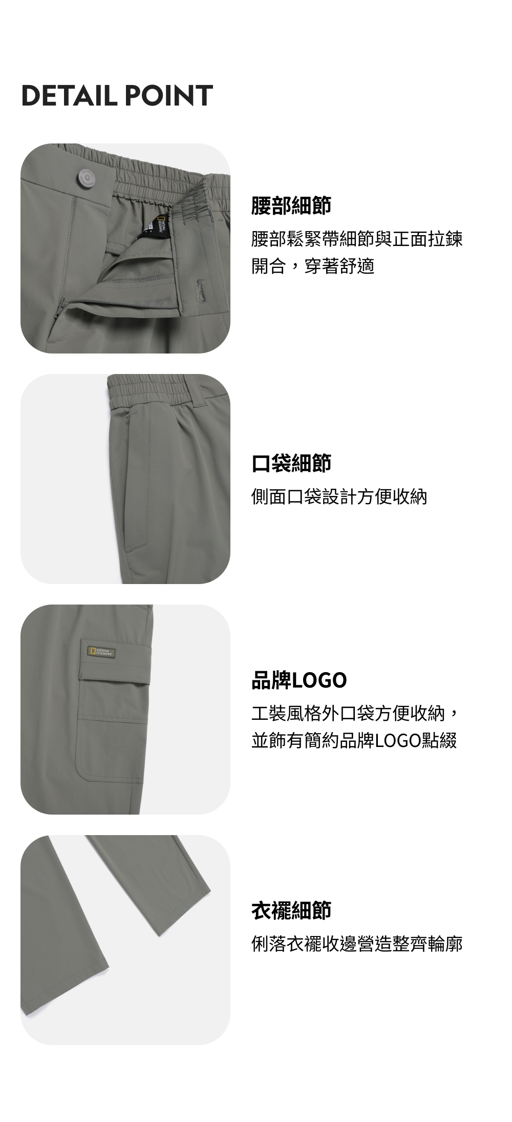 腰部鬆緊帶細節與正面拉鍊開合,穿著舒適