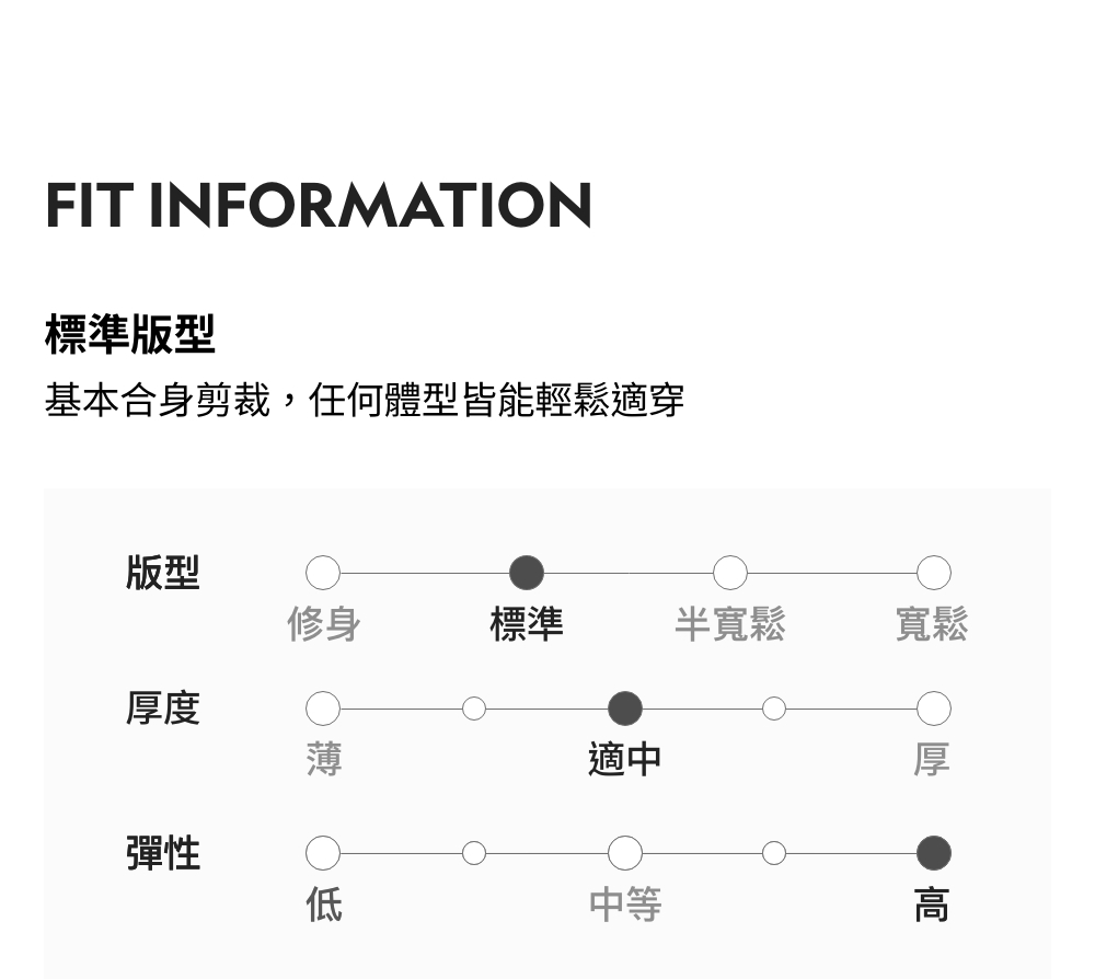標準版型(Regular Fit) / 厚度:適中 / 彈性:高彈