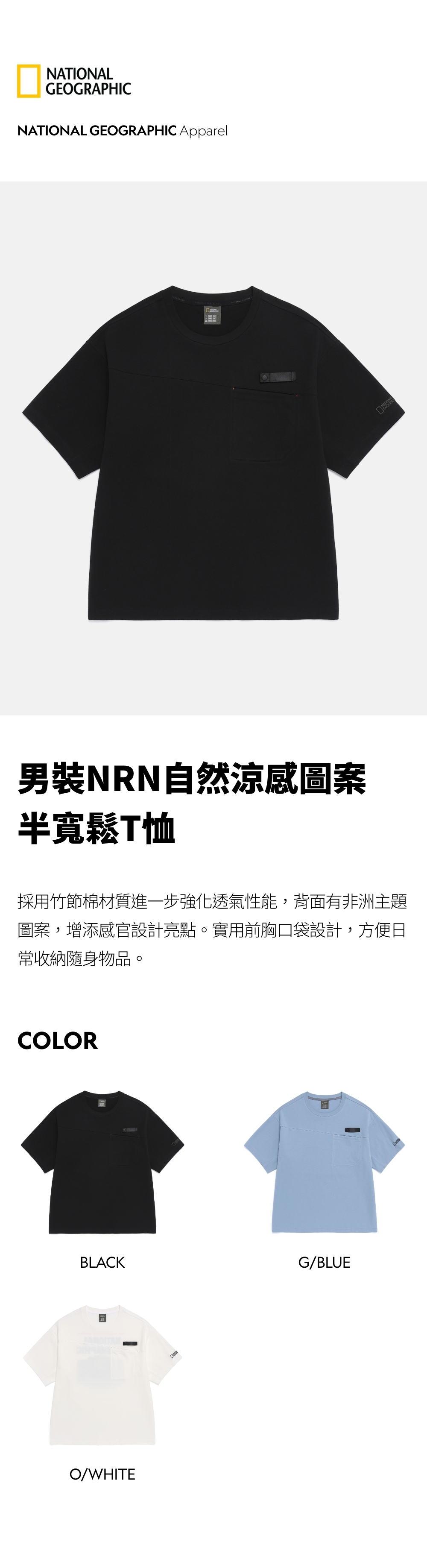 採用竹節棉材質進一步強化透氣性能,背面有非洲主題圖案,增添感官設計亮點。實用前胸口袋設計,方便日常收納隨身物品。