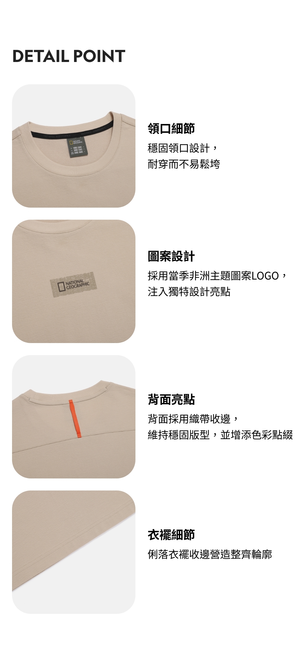 採用竹節棉材質確保透氣舒適,正面有非洲主題的圖案LOGO,展現獨特設計亮點,背面則以織帶收邊細節提升整體設計格調。