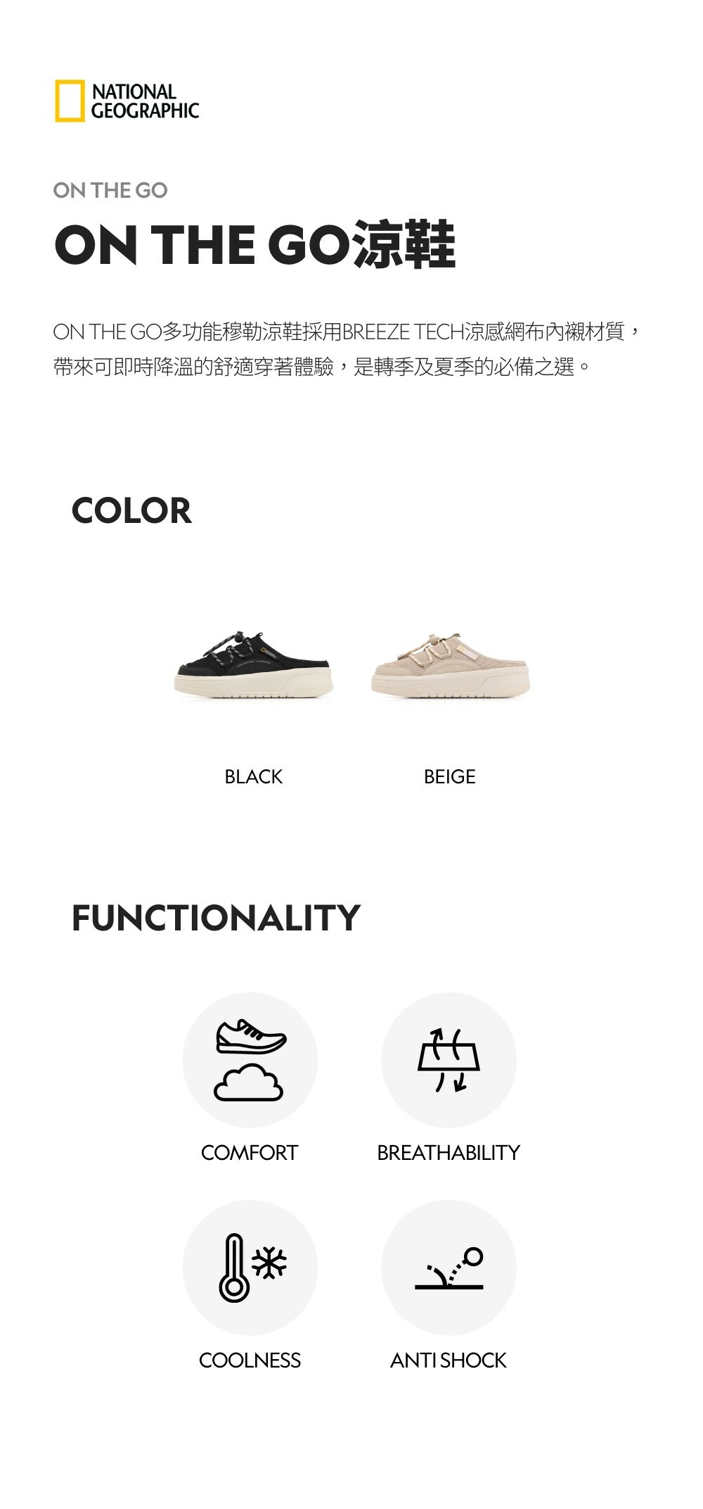 ON THE GO多功能穆勒涼鞋採用BREEZE TECH涼感網布內襯材質,帶來可即時降溫的舒適穿著體驗,是轉季及夏季的必備之選。