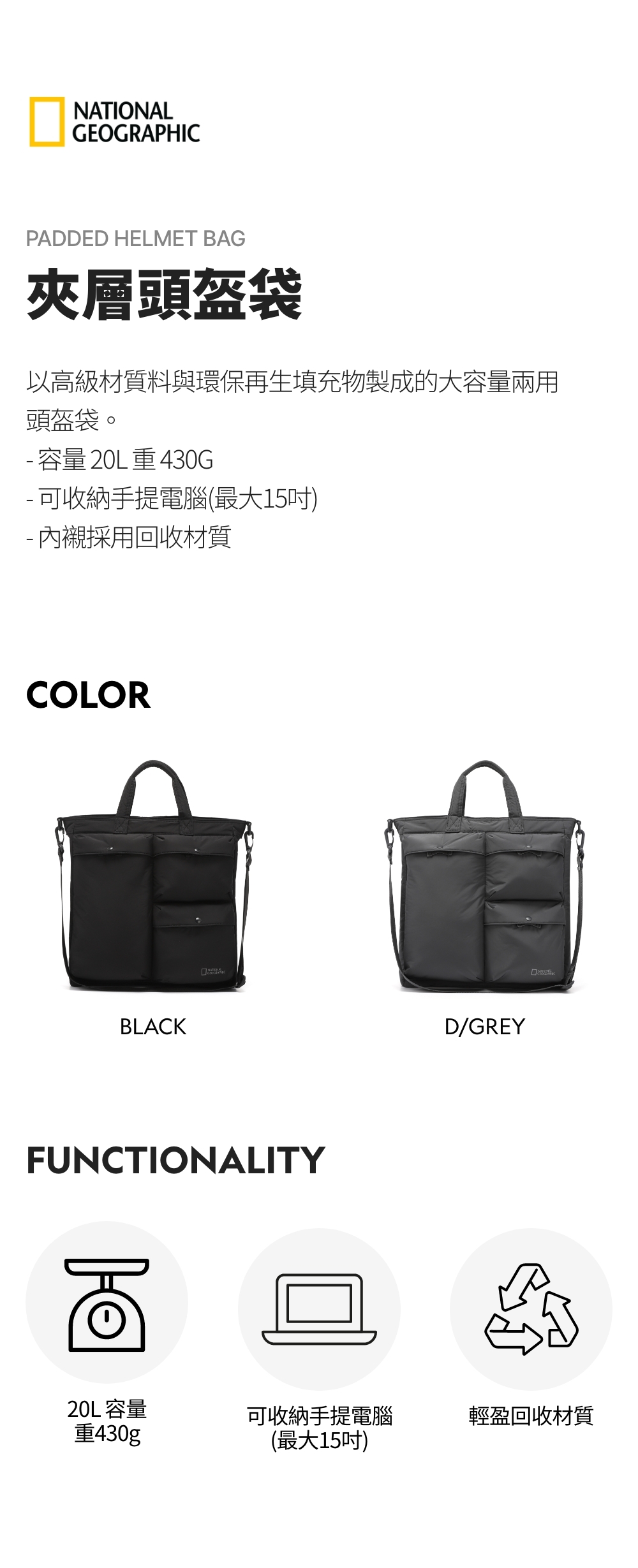 以高級材質料與環保再生填充物製成的大容量兩用頭盔袋。