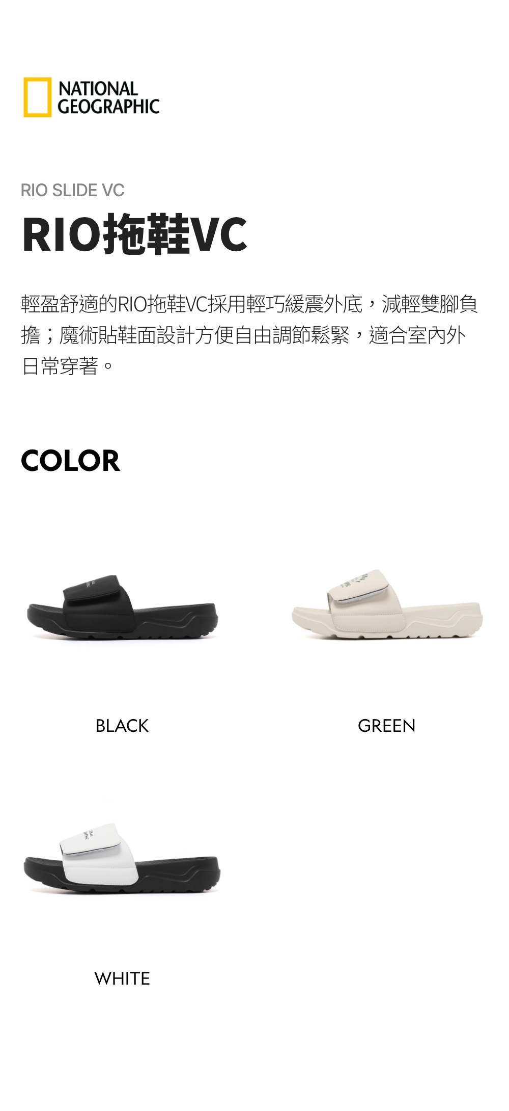 輕盈舒適的RIO拖鞋VC採用輕巧緩震外底,減輕雙腳負擔;魔術貼鞋面設計方便自由調節鬆緊,適合室內外日常穿著。