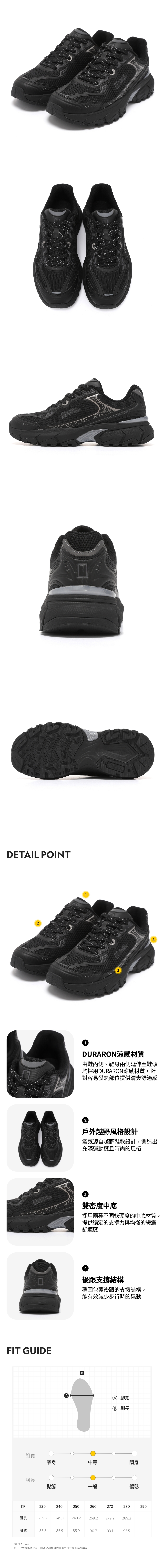 充滿戶外越野感的SHIFT涼感運動鞋採用DURARON涼感材質,提供清爽的穿著體驗,結合後跟支撐結構與雙密度中底,確保行走時的穩定感與均衡的緩震效果。