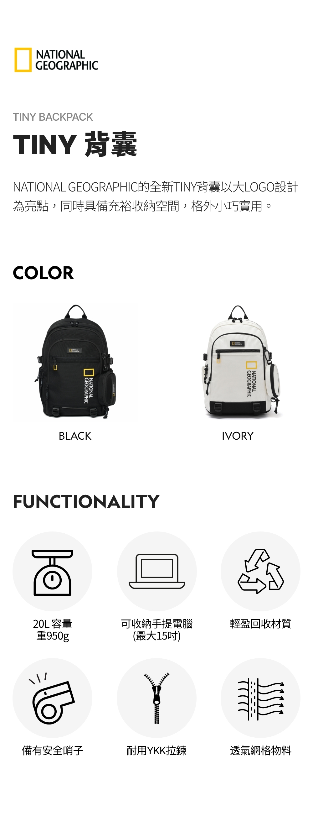 National Geographic的全新TINY背囊以大LOGO設計為亮點,同時具備充裕收納空間,格外小巧實用。