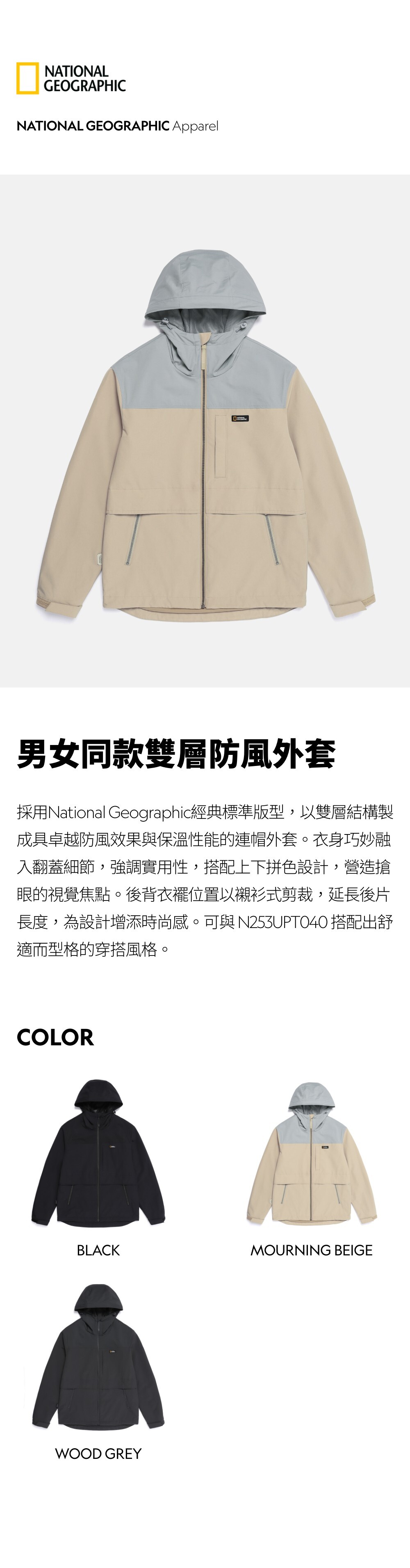 採用National Geographic經典標準版型,以雙層結構製成具卓越防風效果與保溫性能的連帽外套。衣身巧妙融入翻蓋細節,強調實用性,搭配上下拼色設計,營造搶眼的視覺焦點。後背衣襬位置以襯衫式剪裁,延長後片長度,為設計增添時尚感。