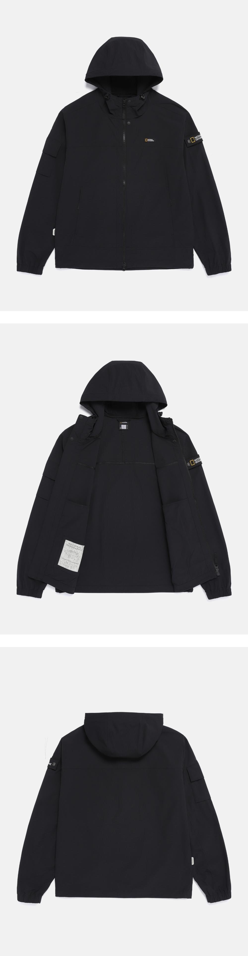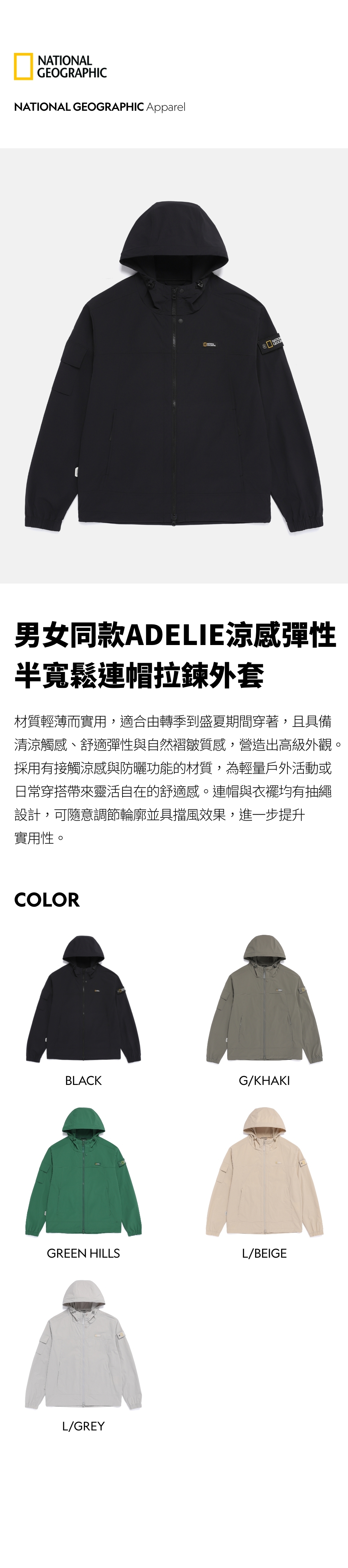 材質輕薄而實用,適合由轉季到盛夏期間穿著,且具備清涼觸感、舒適彈性與自然褶皺質感,營造出高級外觀。採用有接觸涼感與防曬功能的材質,為輕量戶外活動或日常穿搭帶來靈活自在的舒適感。連帽與衣襬均有抽繩設計,可隨意調節輪廓並具擋風效果,進一步提升實用性。