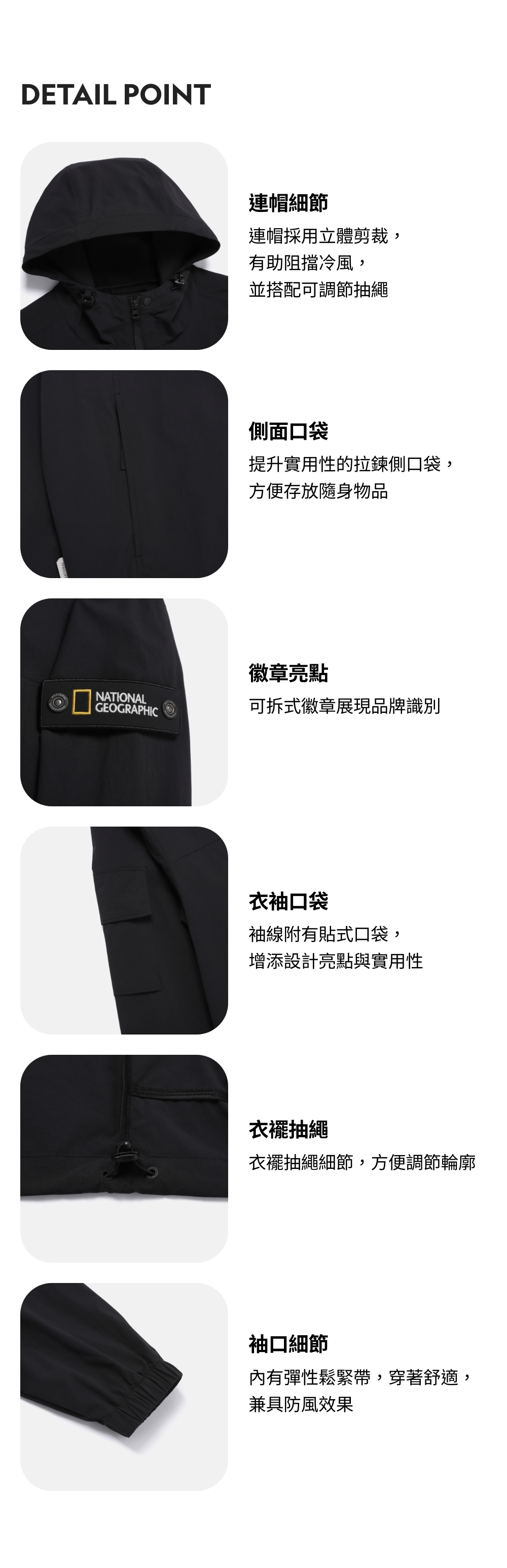 連帽採用立體剪裁,有助阻擋冷風,並搭配可調節抽繩