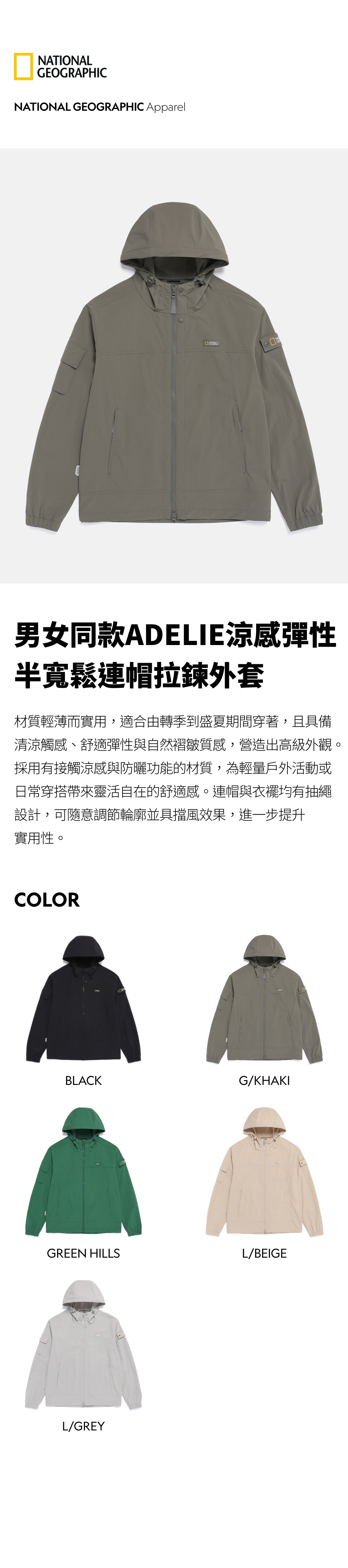 男女同款ADELIE涼感彈性半寬鬆連帽拉鍊外套
