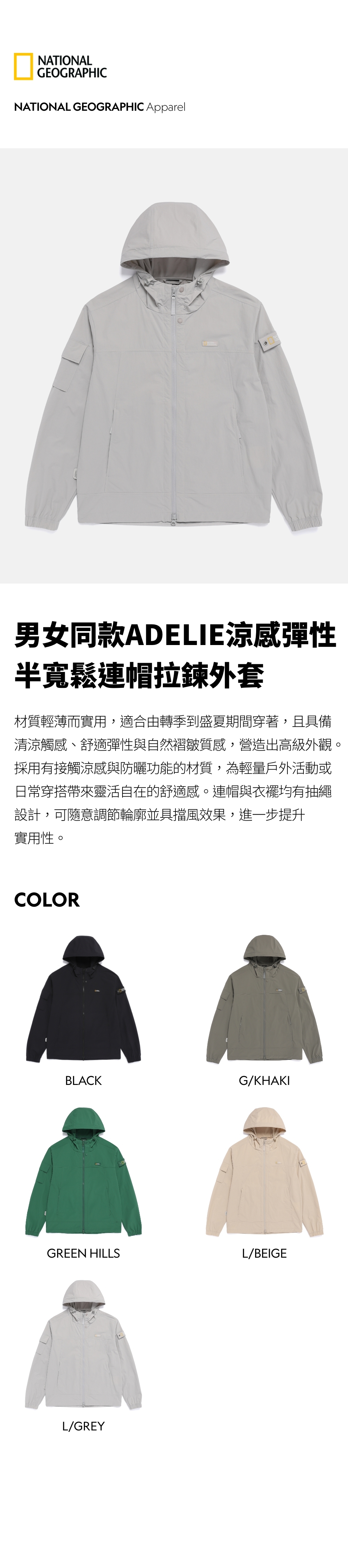 男女同款ADELIE涼感彈性半寬鬆連帽拉鍊外套