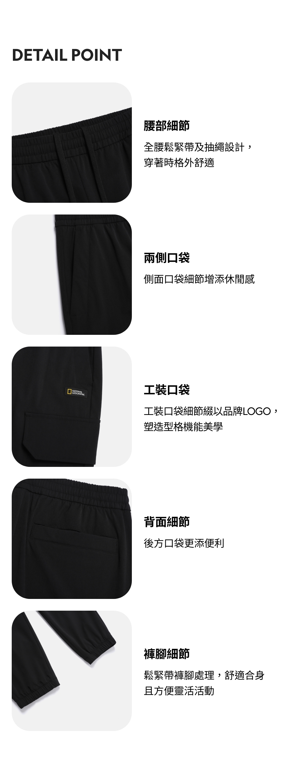 -褲腳細節:鬆緊帶褲腳處理,舒適合身且方便靈活活動