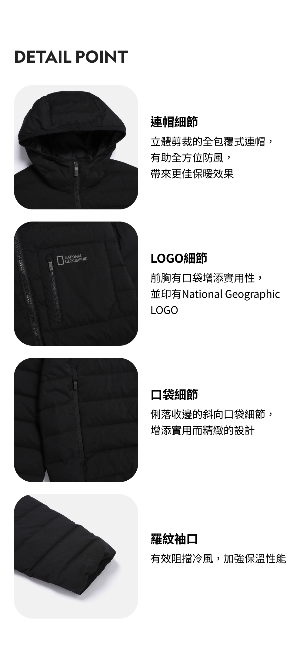 立體剪裁的全包覆式連帽,有助全方位防風,帶來更佳保暖效果