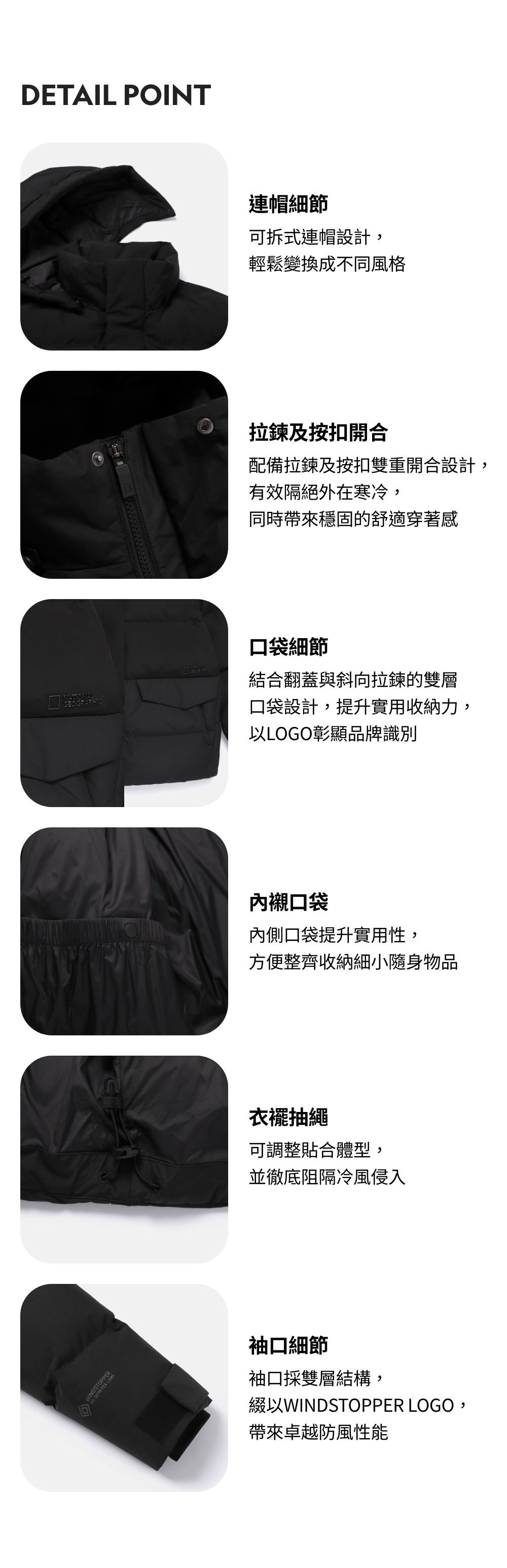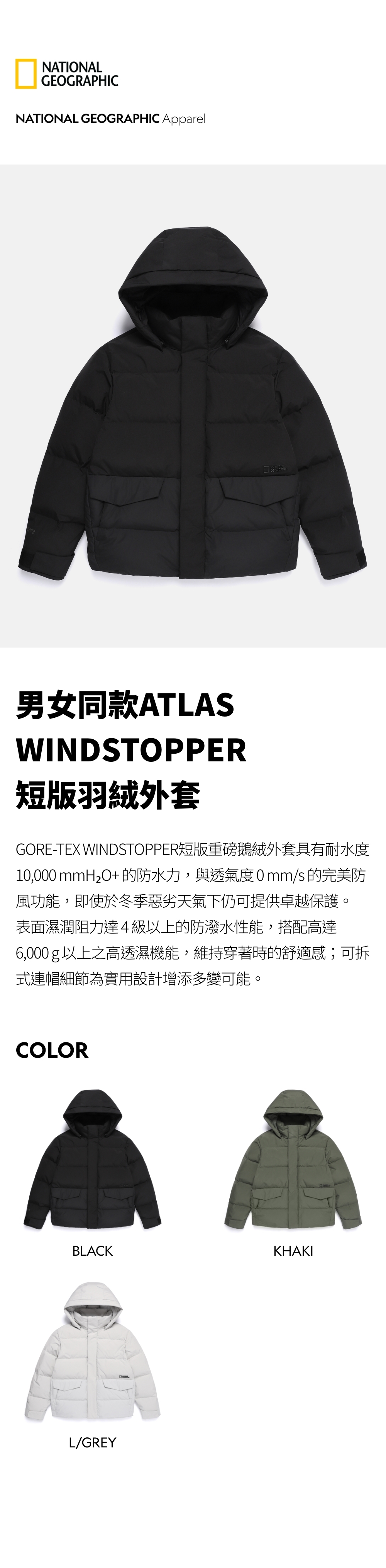 GORE-TEX WINDSTOPPER短版重磅鵝絨外套具有耐水度 10,000 mmH₂O+ 的防水力,與透氣度 0 mm/s 的完美防風功能,即使於冬季惡劣天氣下仍可提供卓越保護。