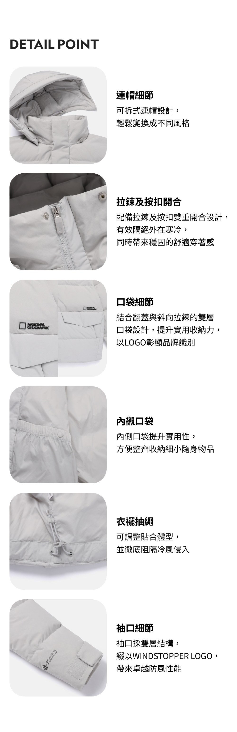 GORE-TEX WINDSTOPPER短版重磅鵝絨外套具有耐水度 10,000 mmH₂O+ 的防水力,與透氣度 0 mm/s 的完美防風功能,即使於冬季惡劣天氣下仍可提供卓越保護。