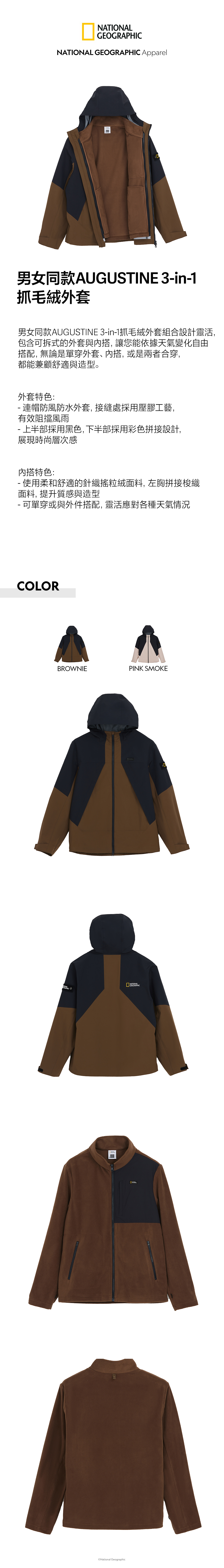 男女同款AUGUSTINE 3-in-1抓毛絨外套組合設計靈活,包含可拆式的外套與內搭,讓您能依據天氣變化自由搭配,無論是單穿外套、內搭,或是兩者合穿,都能兼顧舒適與造型。