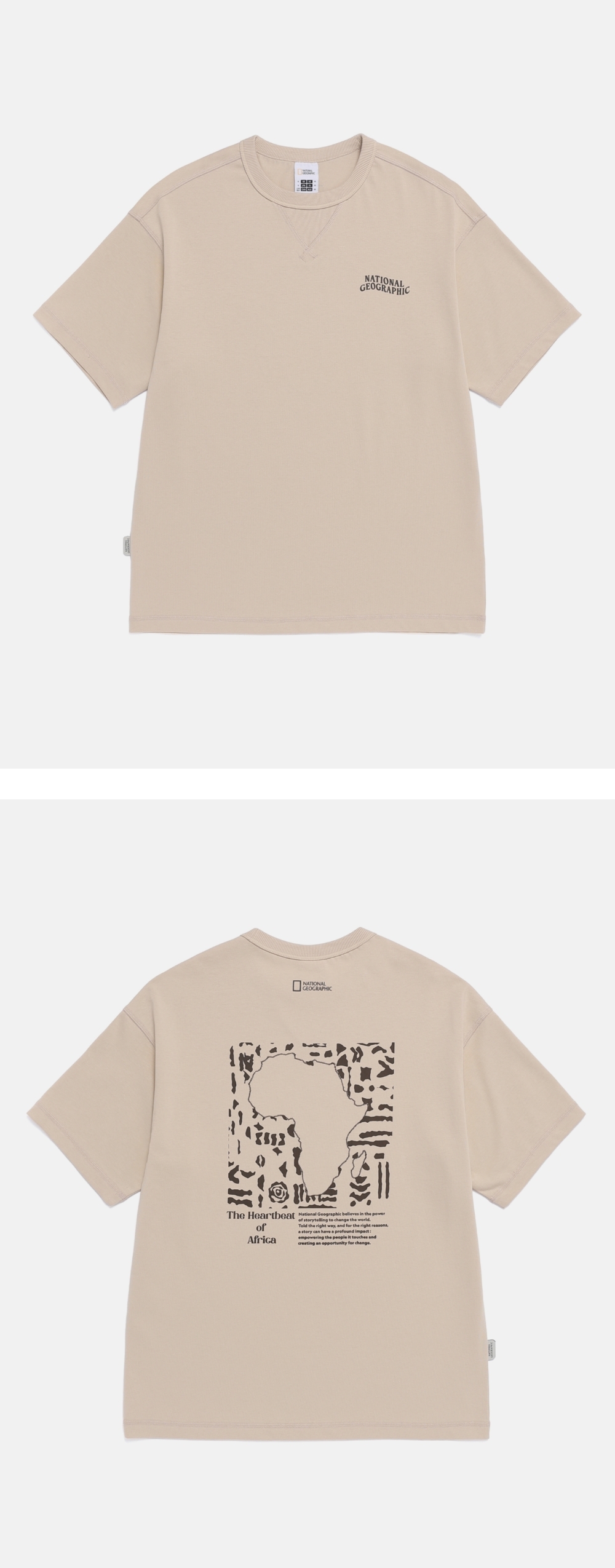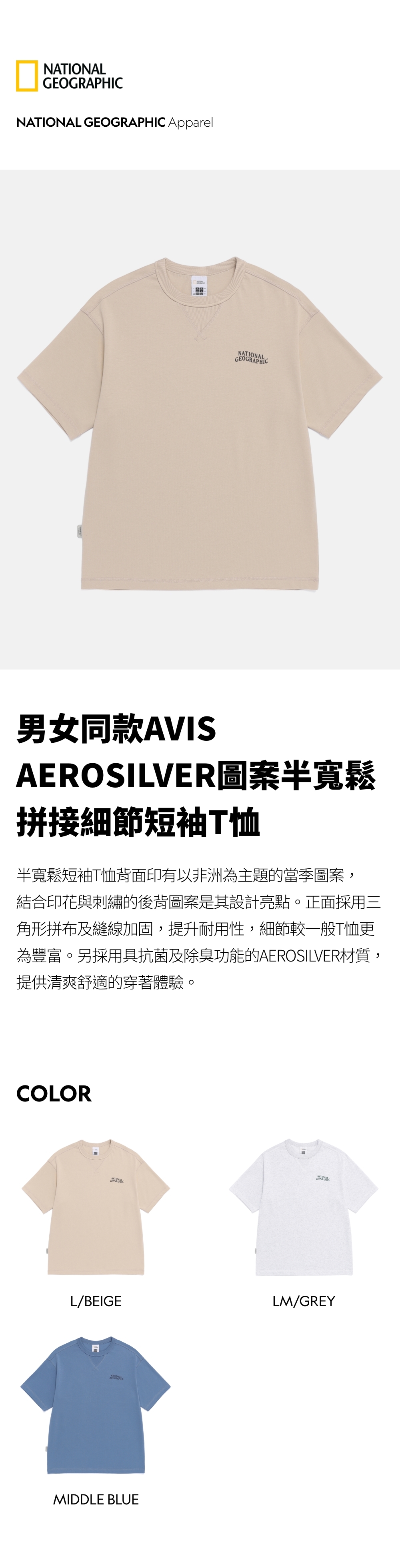 半寬鬆短袖T恤背面印有以非洲為主題的當季圖案,結合印花與刺繡的後背圖案是其設計亮點。正面採用三角形拼布及縫線加固,提升耐用性,細節較一般T恤更為豐富。另採用具抗菌及除臭功能的AEROSILVER材質,提供清爽舒適的穿著體驗。