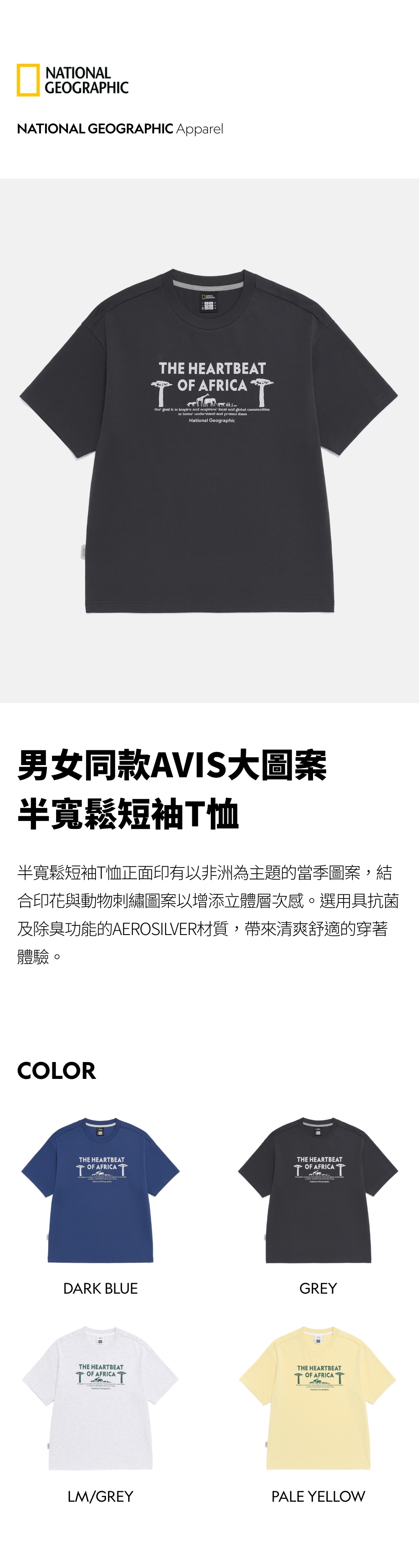 半寬鬆短袖T恤正面印有以非洲為主題的當季圖案,結合印花與動物刺繡圖案以增添立體層次感。選用具抗菌及除臭功能的AEROSILVER材質,帶來清爽舒適的穿著體驗。