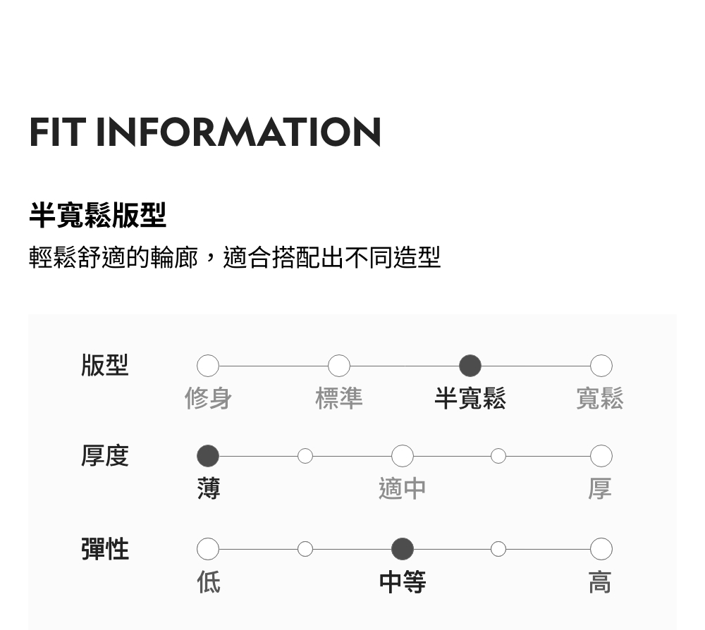 半寬鬆版型 / 厚度:薄 / 彈性:中等