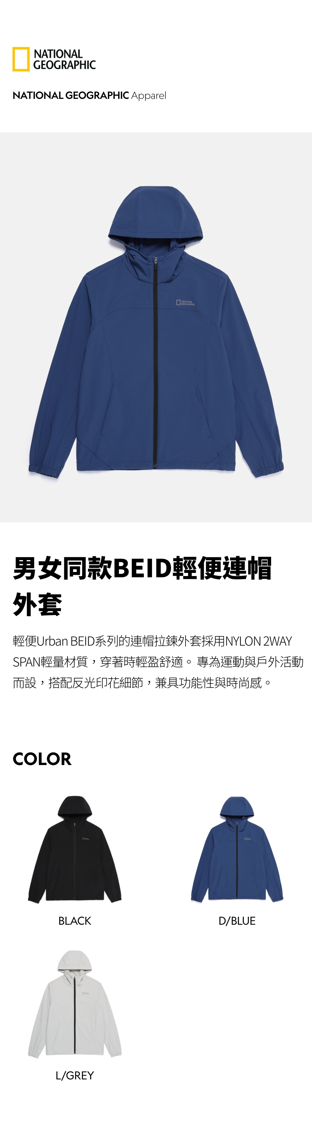 輕便Urban BEID系列的連帽拉鍊外套採用NYLON 2WAY SPAN輕量材質,穿著時輕盈舒適。