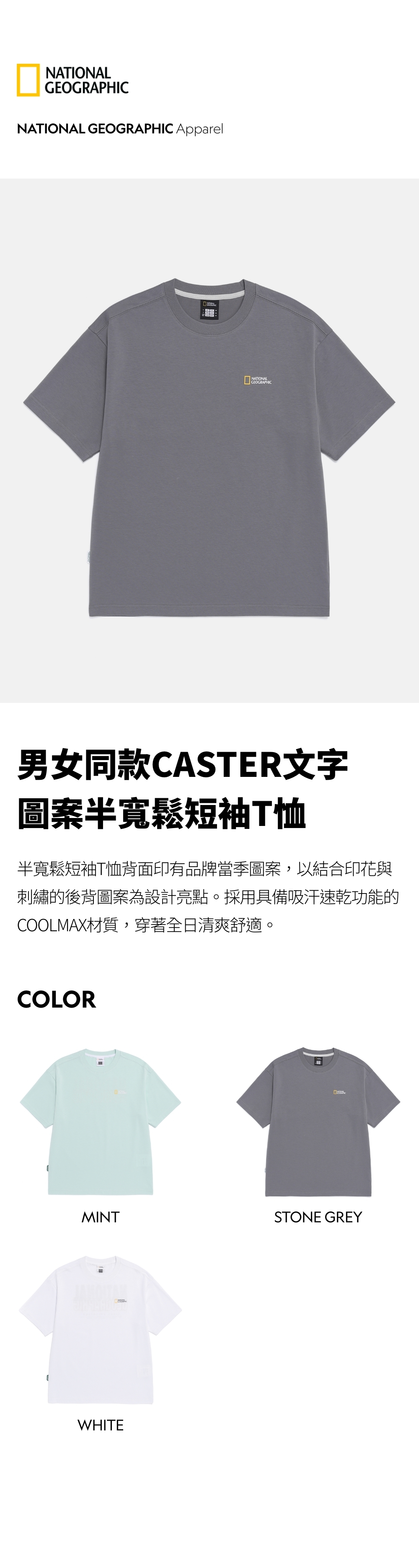 半寬鬆短袖T恤背面印有品牌當季圖案,以結合印花與刺繡的後背圖案為設計亮點。採用具備吸汗速乾功能的COOLMAX材質,穿著全日清爽舒適。